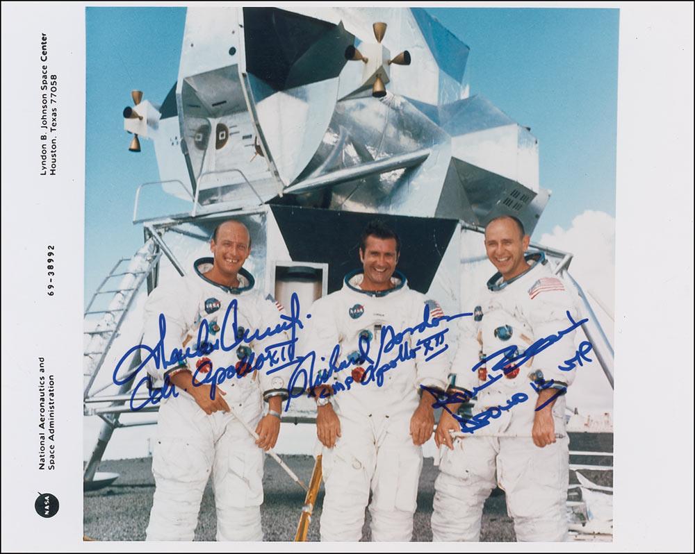 Color satin-finish 10 x 8 second generation official NASA numbered photo of the Apollo 12 crew posing with their lunar lander, signed in blue felt tip by Charles Conrad, Richard Gordon, and Alan Bean, all adding their assignments under their signatures. In fine condition, with a slightly fuzzy appearance to image.