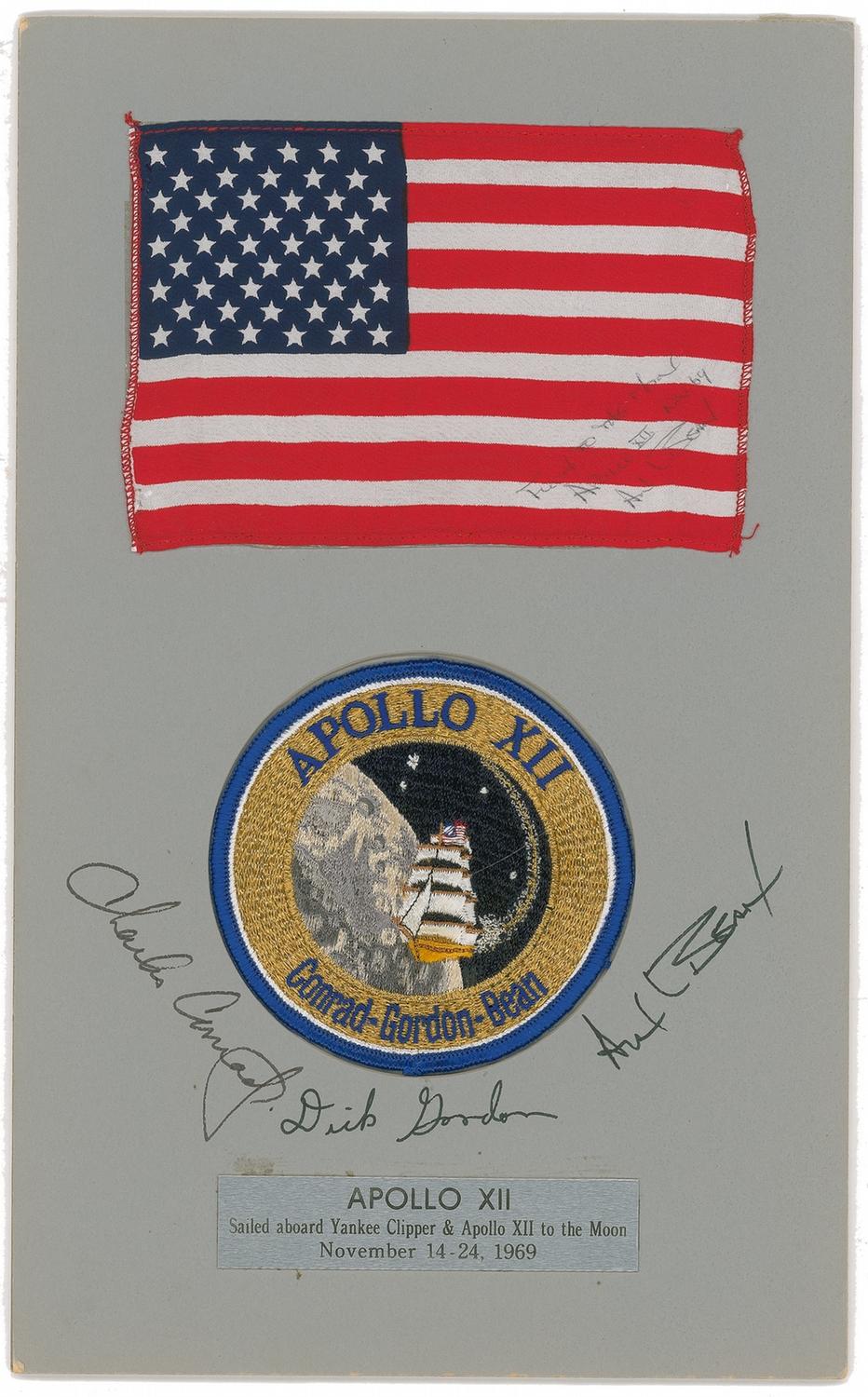Flight-flown printed fabric American flag, 6 x 4, flown aboard Apollo 12 during its flight to the moon. Flag is signed in black ink, “Flown to the Moon. Apollo XII Nov. 69. Alan L. Bean” and is affixed by its corners to an 8 x 13 piece of heavy cardstock with a small plaque stating “Sailed aboard Yankee Clipper & Apollo XII to the Moon. November 14-24, 1969.” The board is also signed in black felt tip by crew members Charles Conrad, Dick Gordon, and Bean. A mission patch is affixed, as well. In fine condition.