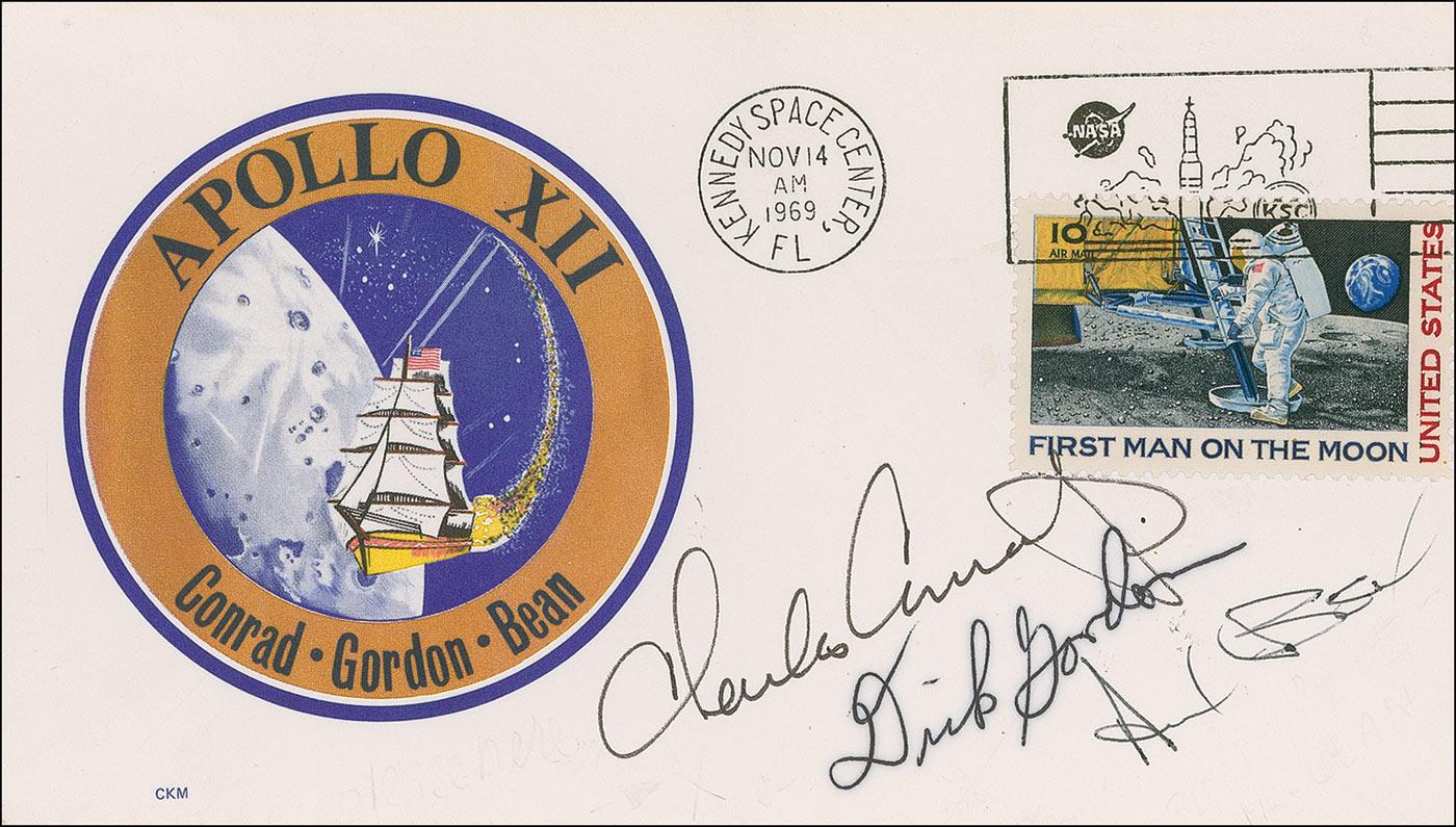 Apollo 12 launch date postal cover bearing a cachet of the Apollo 12 mission emblem, signed in black ink by Charles Conrad, Dick Gordon, and Alan Bean. In fine condition, with a bit of mild haloing around Gordon’s signature.