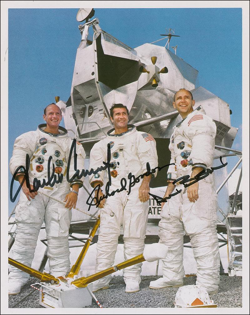 Color 8 x 10 NASA photo of the Apollo 12 crew posing with a lunar lander during their training, signed in black felt tip by Charles Conrad, Alan Bean, and Richard Gordon. In fine condition, with a few scattered light surface bends.