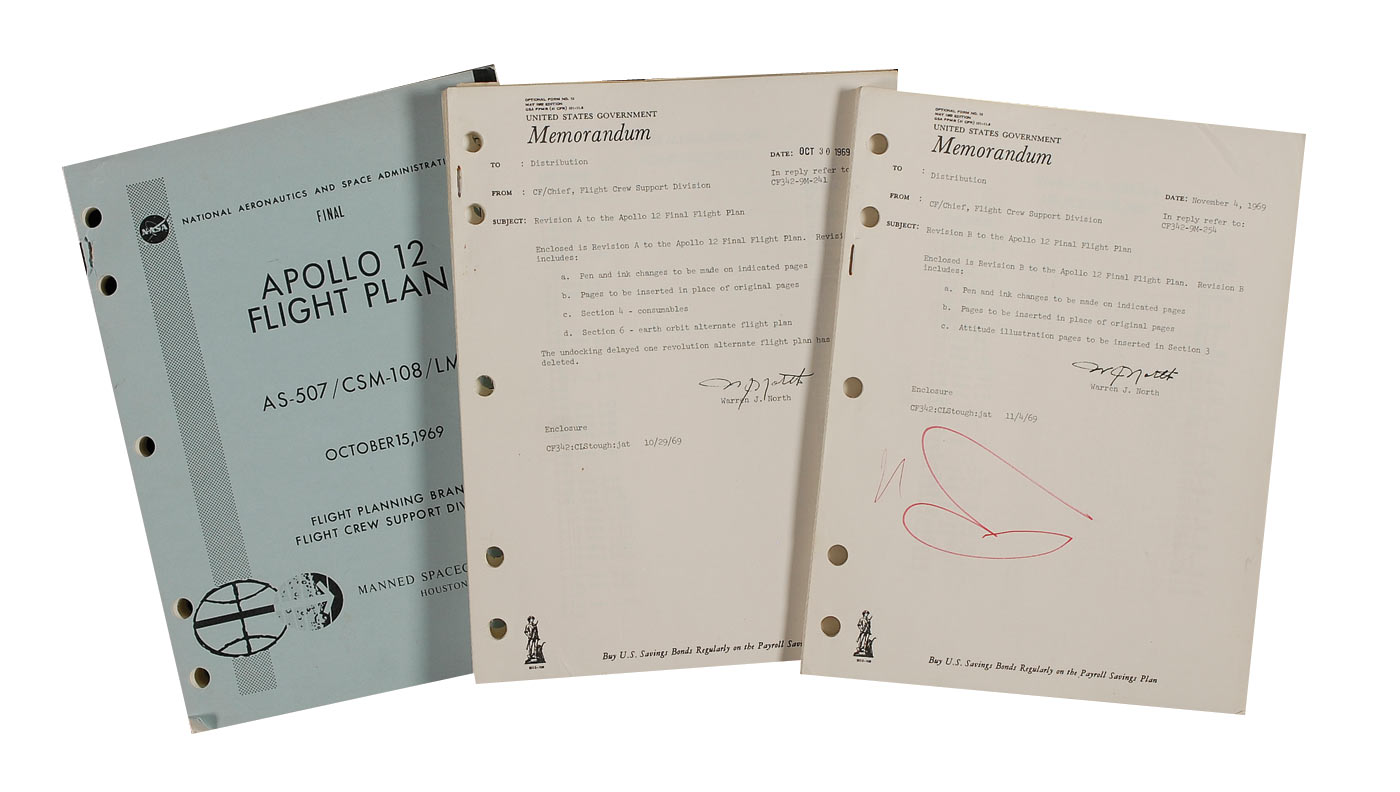 Printed Apollo 12 Flight Plan, “AS-507/CSM-108/LM-6,” dated October 15, 1969, bound by a staple to the left edge, measuring 8.x 10.5, providing a minute-by-minute time frame for the entire mission, including the moonwalks. First page is a copy of the flight plan submission bearing copies of signatures of C. L. Stough, Warren J. North, James McDivitt, and Christopher Kraft. In fine condition, with expected handling wear,and light toning and creasing to cover. Accompanied by two printed memorandums, one headed “Revision A to the Apollo 12 Final Flight Plan,” dated October 30, 1969, full of revisions to the original plan, and the second is a printed multi-page memorandum, 8.5 x 11, headed “Revision B to the Apollo 12 Final Flight Plan,” issued by Warren J. North, dated November 4, 1969. Memo contains 45 revisions to the plan, complete with procedures and diagrams.