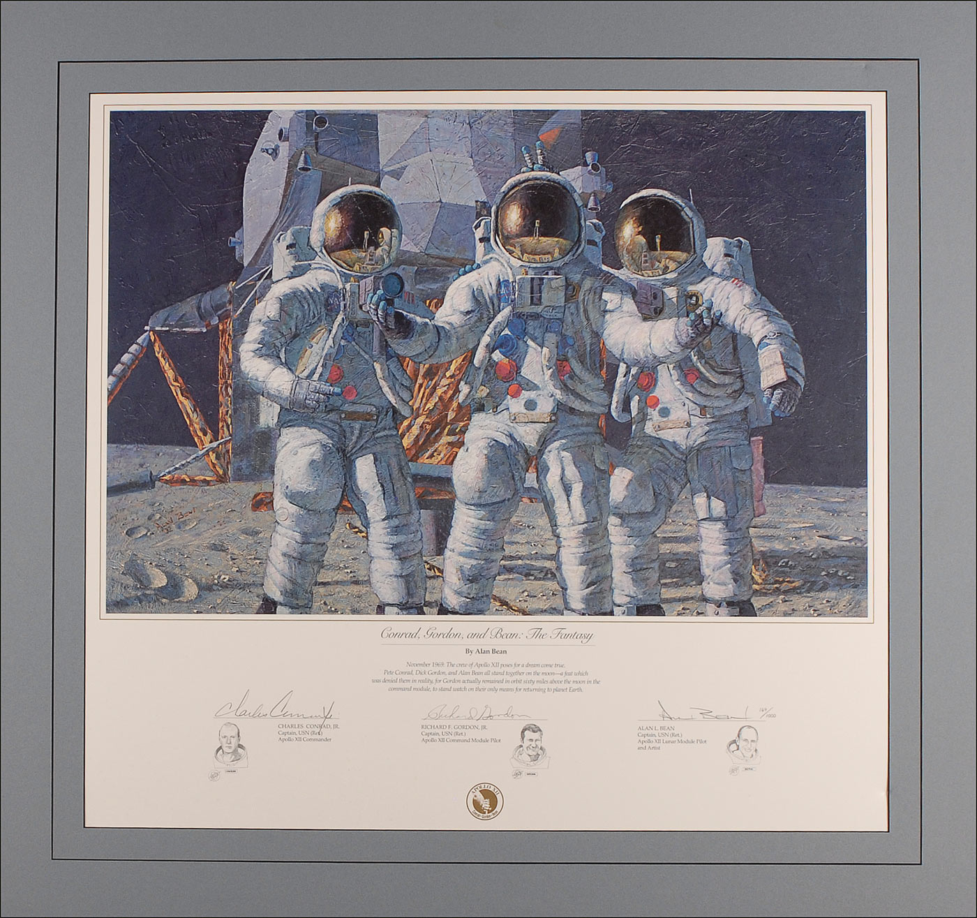 Color limited edition 25 x 23 lithograph entitled ‘Conrad, Gordon, and Bean: The Fantasy,’ numbered #169/1000, depicting all three members of Apollo 12 together on the lunar surface, signed in pencil by Charles Conrad, Richard Gordon, and Alan Bean. Matted to an overall size of 31 x 29. In fine condition.