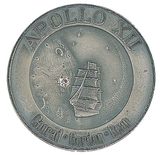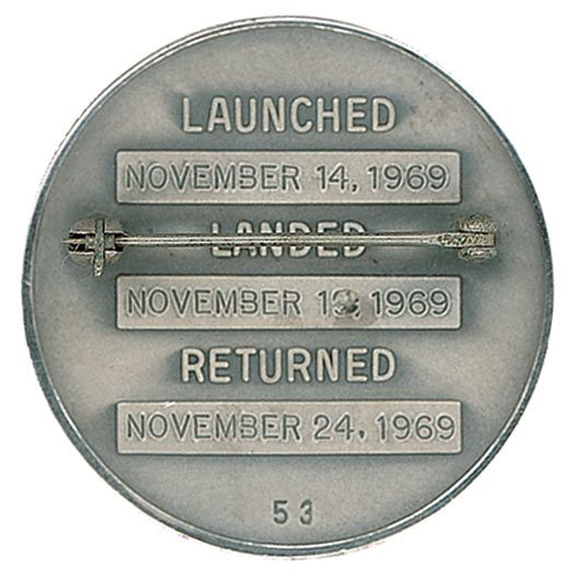 Rare flown Apollo 12 Robbins Medal, approximately 1.25 diameter, with a raised design on the face of the Apollo 12 mission insignia. The reverse of the sterling silver medal is engraved with the November 14, 1969, launch date, November 19, 1969, moon landing date, and November 24, 1969, return date. This medal is serial numbered “53” and has been converted into a pin with a silver pin-back added and with a diamond inset into the moon landing site. These medallions were modified in this manner by Alan Bean and his wife. Normal condition.