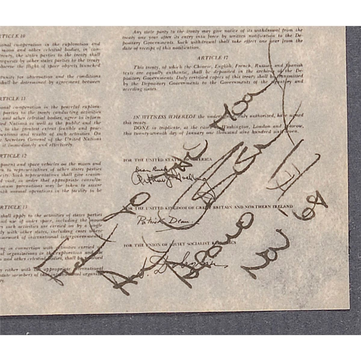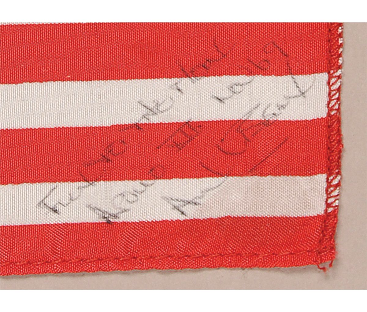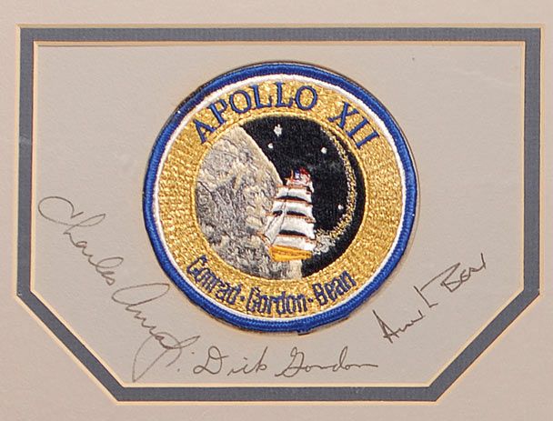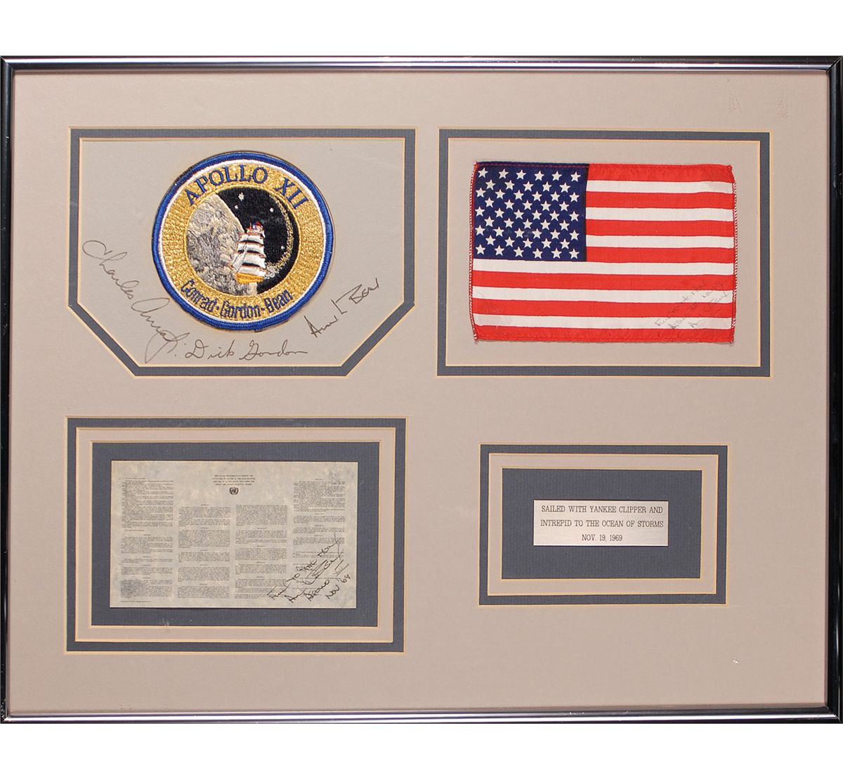 Flown printed fabric American flag, 6 x 4, signed in black ink, “Flown to the Moon, Apollo XII, Nov. 69, Alan Bean,”; a flown printed UN Space Treaty, 5.25 x 3, entitled “Treaty of the Principles Governing the Activities of States in the Exploration and Use of Outer Space, Including the Moon and Other Celestial Bodies,” signed in black felt tip, “Flown to the Moon, Alan Bean, Apollo XII, Nov ‘69”; and an Apollo XII mission patch affixed to a 7.25 x 5 gray mat, signed on the mat in black felt tip by Charles Conrad, Dick Gordon, and Alan Bean. All three are double matted together with a small plaque to an overall size of 18.75 x 15. In fine condition, with signature on flag a shade or two light, but still legible. A great combination of two flown items from man’s second moon landing.