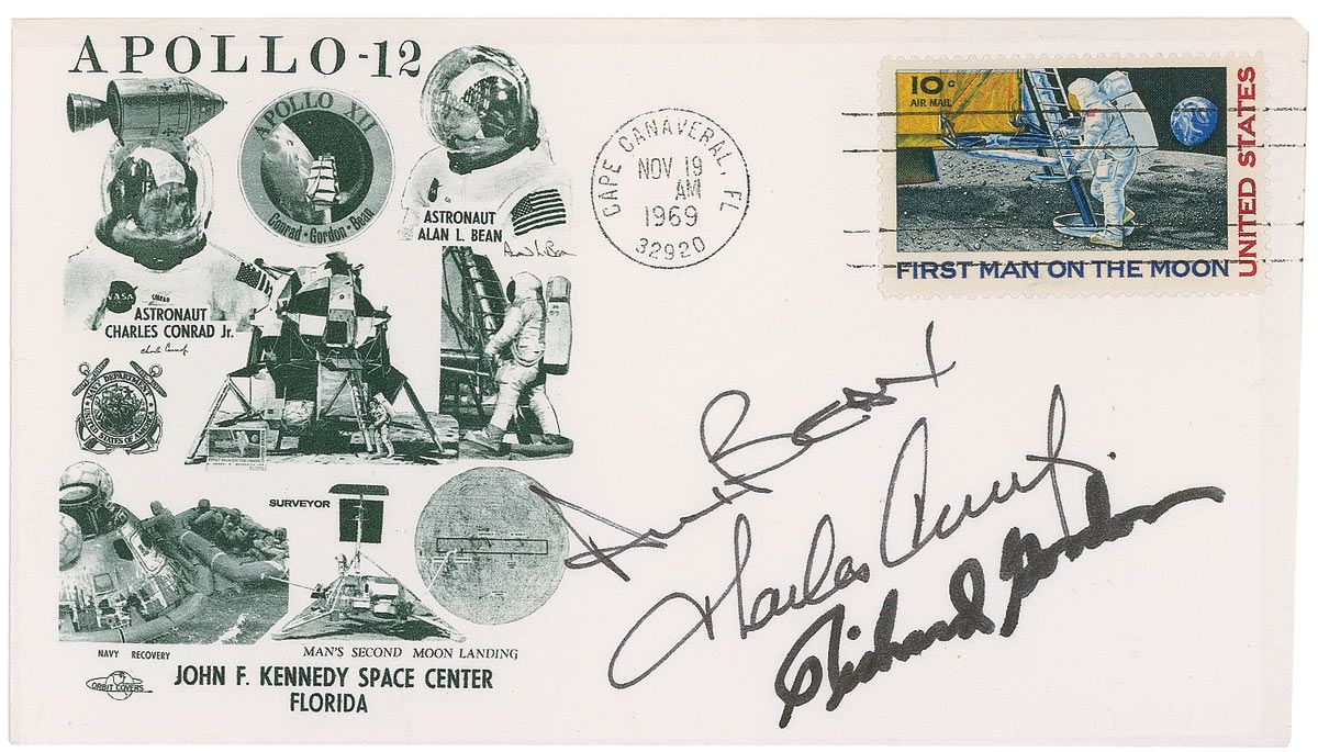 Flawless commemorative cover honoring the Apollo 12, postmarked November 19, 1969, the date of the lunar landing, signed in black felt tip by Alan Bean, Charles Conrad, and Richard Gordon. In fine condition.