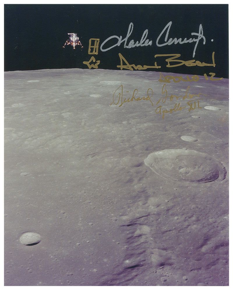 Color satin-finish 8 x 10 photo of the Apollo 12 lunar module descending to the moon’s surface, signed in gold ink, “Alan Bean, Apollo 12,” adding a small sketch and “Richard Gordon, Apollo XII,” and signed in silver ink, “Charles Conrad, Jr.” In fine condition, with some feathering to Conrad’s signature.