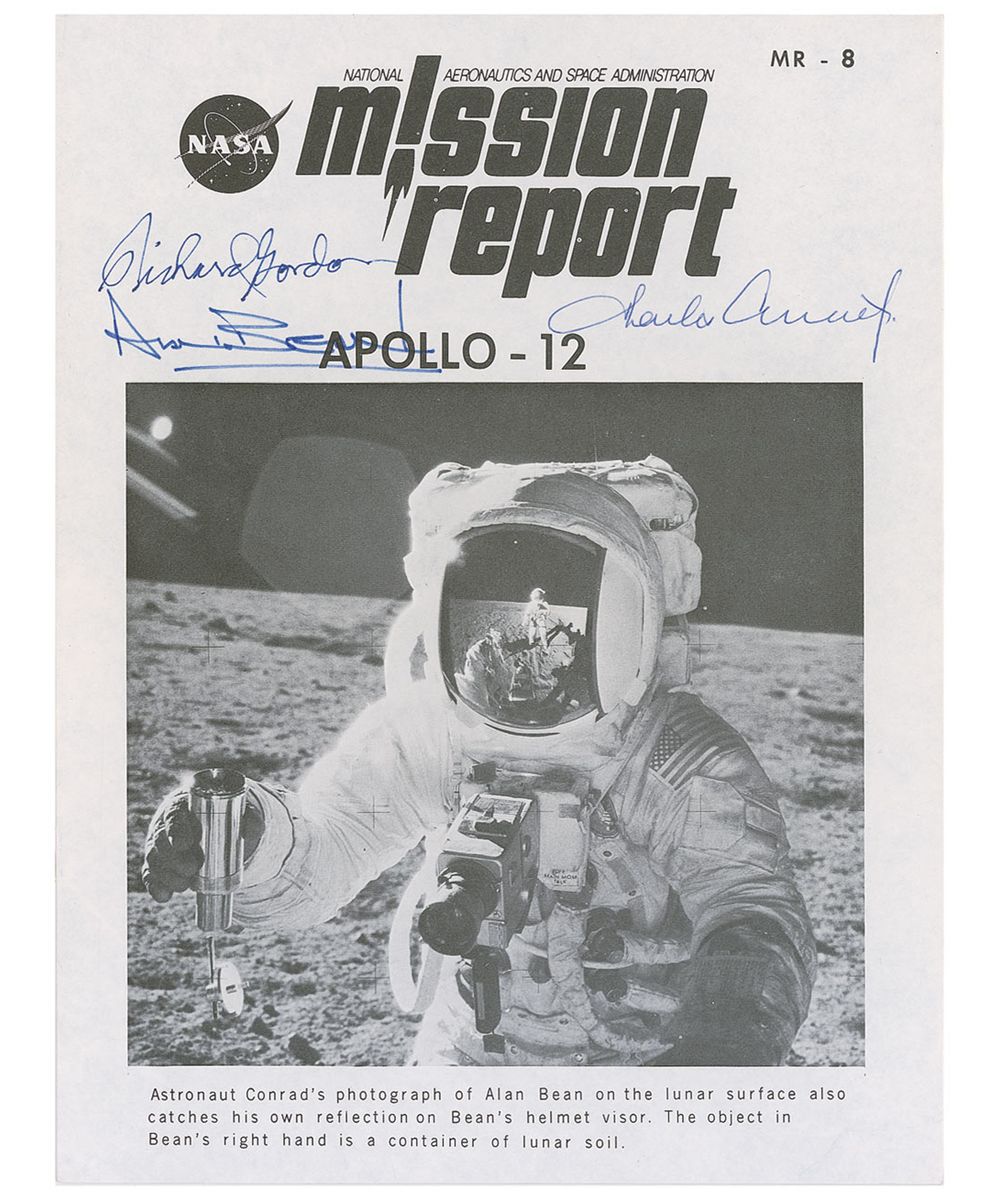 Apollo 12 Mission Report, 8.5 x 11, 16 pages. Report is full of photos, reports, and experiment results from the mission. Signed on the front cover in blue ink and felt tip by Alan Bean, Richard Gordon, and Charles Conrad. In fine condition.