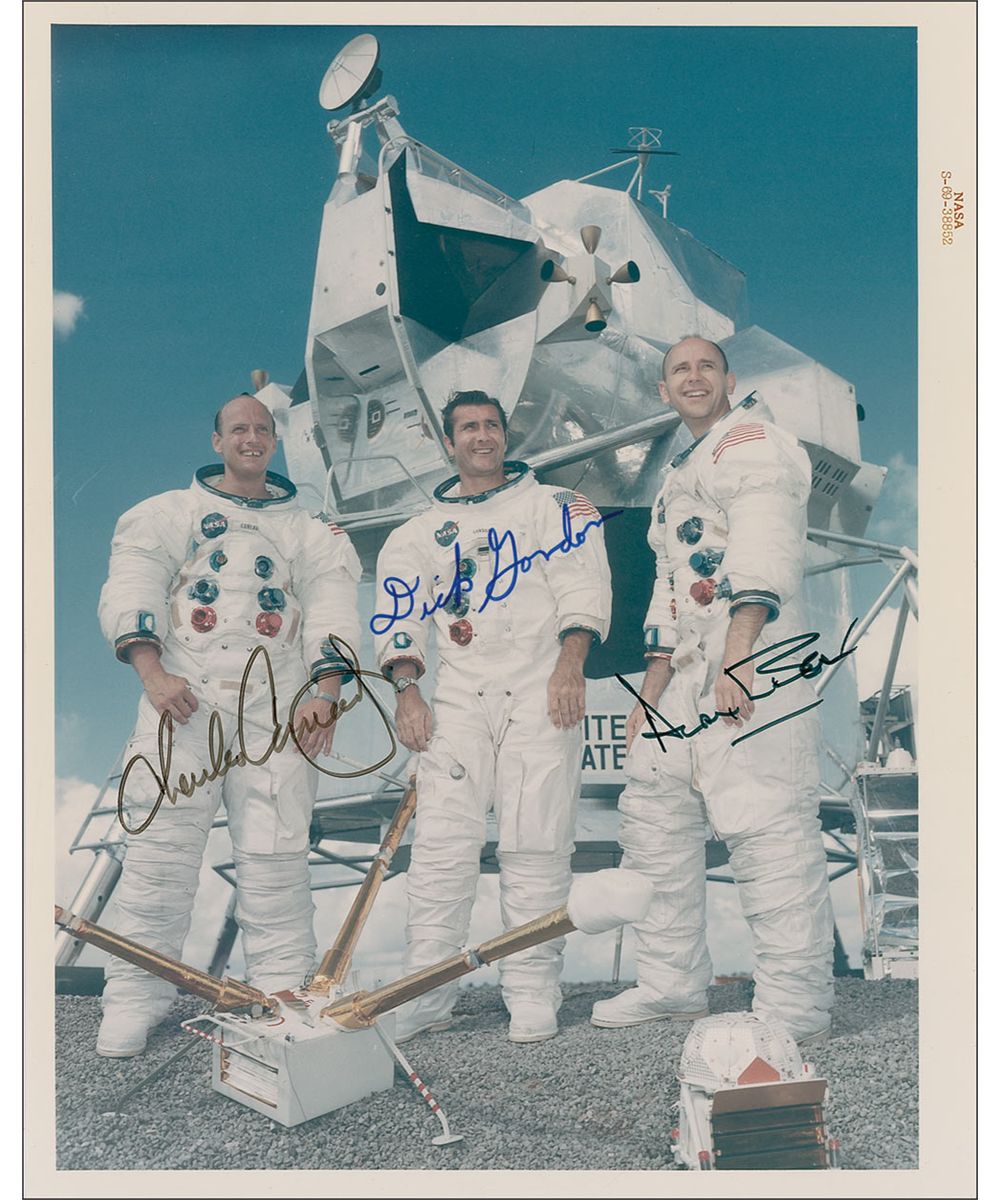 Immaculate color glossy 8 x 10 ‘red-numbered’ NASA photo, of all three crew members posing in their white spacesuits next to a lunar lander during training, signed in black felt tip by Charles Conrad and Alan Bean, and signed in blue felt tip by Dick Gordon. In very fine condition. Accompanied by a letter from Walter Cunningham. This image heralds directly from Cunningham’s personal collection.