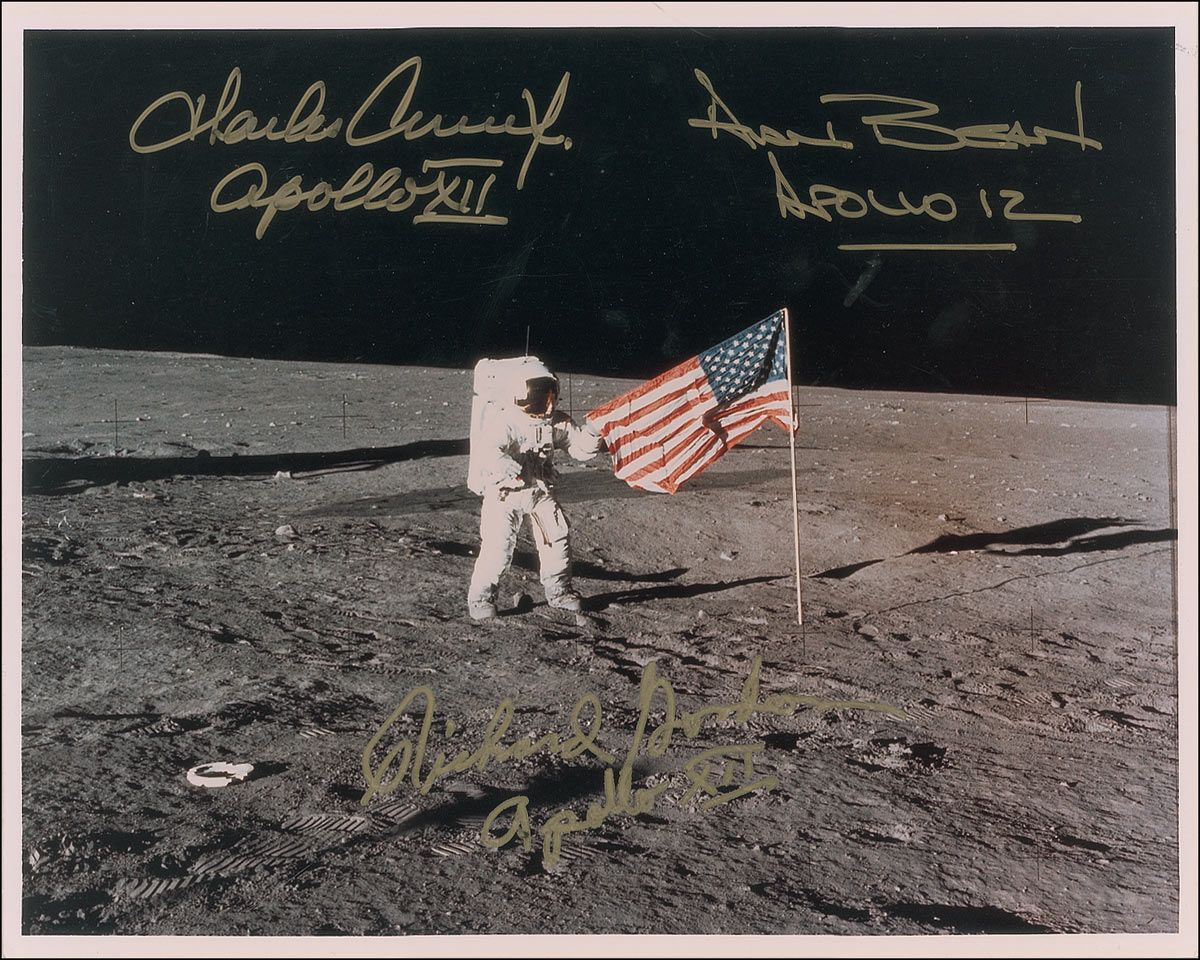 Stunning color satin-finish 10 x 8 photo of Charles Conrad posing with the American flag on the lunar surface, signed in gold ink by Charles Conrad, Alan Bean, and Dick Gordon, with each adding their mission. In fine condition. Accompanied by a photo of Bean taken at the time of signing. This particular signed image of Conrad on the moon is a scarce.