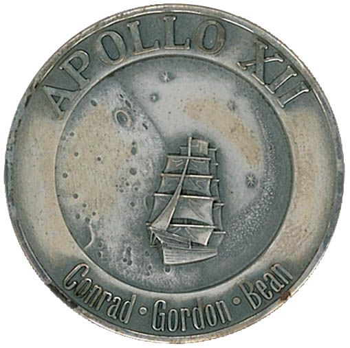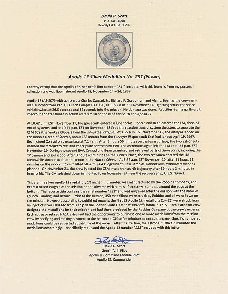 Flown Apollo 12 Robbins Medal, approximately 1.25 diameter, with a raised design on the face of the Apollo 12 mission insignia. The reverse of the sterling silver medal is engraved with the November 14, 1969, launch date; November 19, 1969, moon landing date; and November 24, 1969, return date. This medal is serial numbered “231.” Condition is mint state. Medal comes in its original case, numbered “231.”Accompanied by a letter of authenticity from Dave Scott stating, in part: “I hereby certify that the Apollo 12 silver medallion numbered ‘231’ included with this letter is from my personal collection and was flown aboard Apollo 12, November 14-24, 1969…After the mission, the Astronaut Office distributed the medallions accordingly. I specifically requested the Apollo 12 number ‘231’ included with this letter.” Provenance: Dave Scott.
