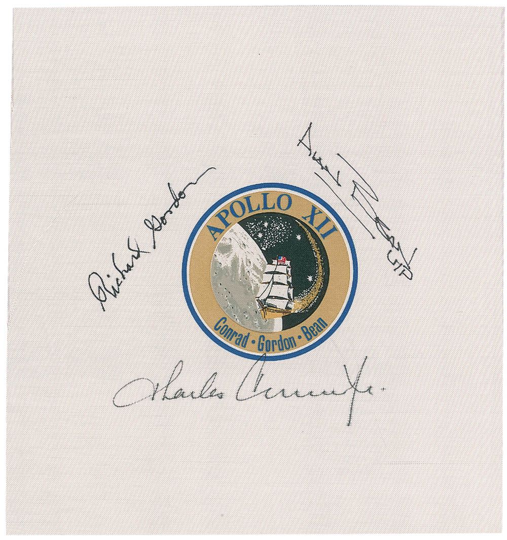 An 8.5 x 9 swatch of Beta cloth, bearing a printed 3-inch diameter Apollo 12 mission emblem, signed in black felt tip by Alan Bean, Charles Conrad, and Richard Gordon. In fine condition.