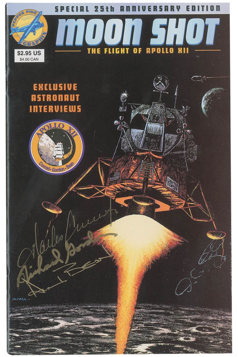 Twenty-fifth anniversary edition comic book entitled “Moon Shot: The Flight of Apollo 12,” 6.5 x 10.5, signed on the cover in gold ink by crew members Charles Conrad, Richard Gordon, and Alan Bean, and also signed on the cover in silver ink by writer D. C. Agle. In fine condition, with some light brushing to Agle’s signature.