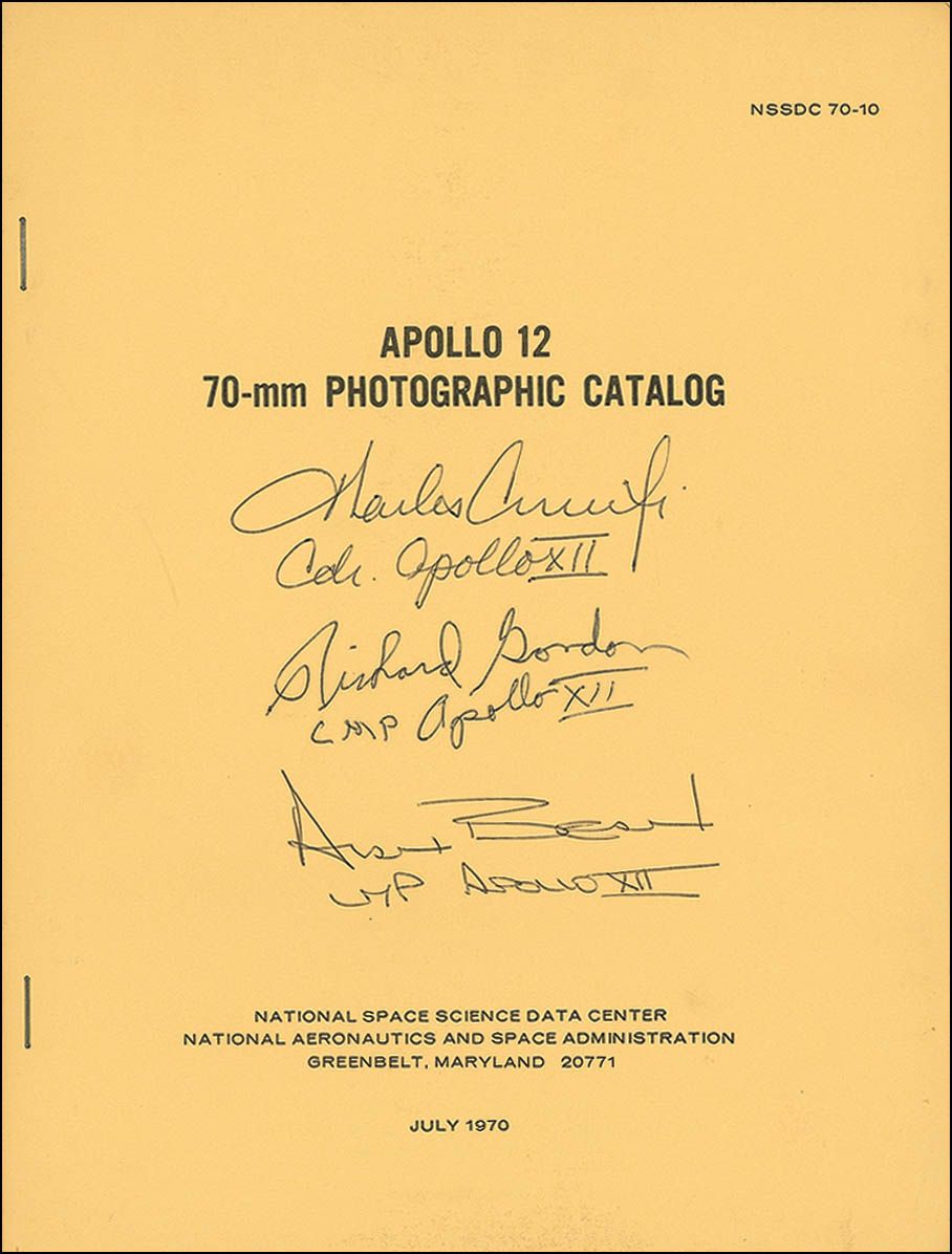 Apollo 12 70-mm Photographic Catalog NSSDC 70-10, 8 x 10.5, July 1970, signed on the front cover in black ballpoint, “Charles Conrad, Jr., Cdr. Apollo XII,” “Richard Gordon, CMP Apollo XII,” and “Alan Bean, LMP Apollo XII.” Catalog featuring the 70-mm photographs exposed during the Apollo 12 mission, sorted by magazine and frame number. Mild soiling to the covers, felt tip notation to the spine, and slight haloing to Gordon’s signature, otherwise fine condition.