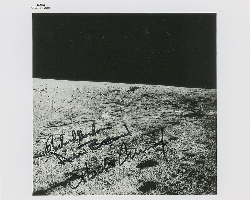 Color glossy 10 x 8 photo of the lunar surface, signed in black felt tip by Richard Gordon, Alan Bean, and Charles Conrad. In very fine condition.
