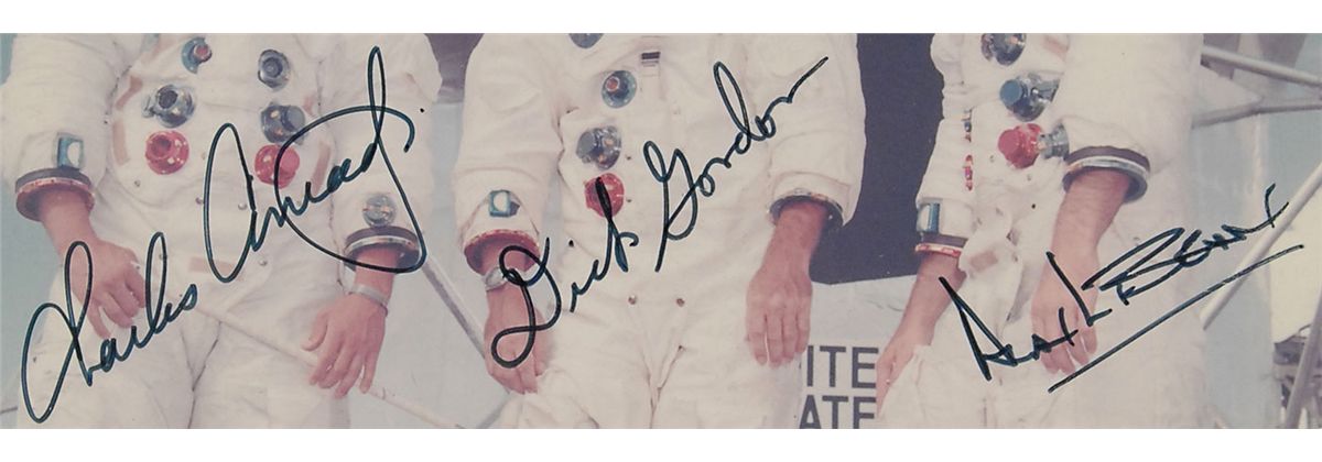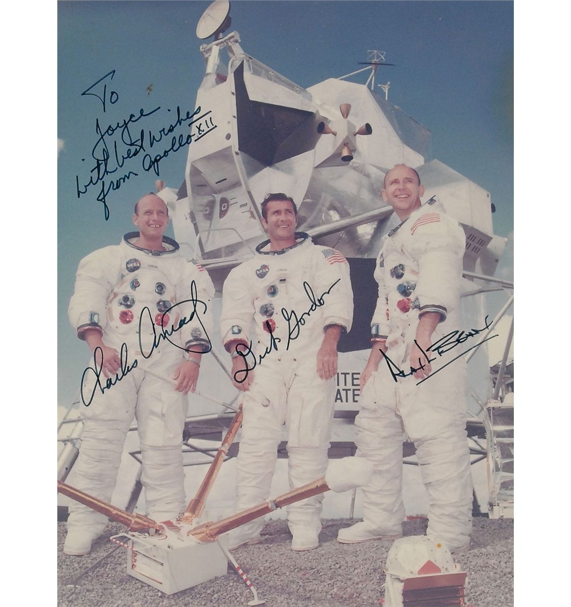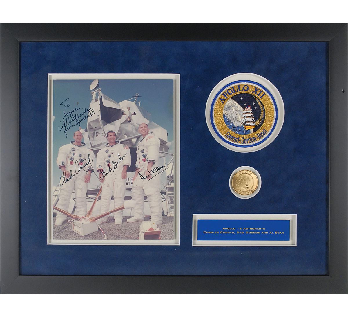 Color official NASA lithograph of the Apollo 12 crew posing in front of an LEM during training, trimmed to a size of 7 x 9.25, signed and inscribed in black felt tip, “To Joyce, with best wishes from Apollo XII, Charles Conrad, Jr.,” “Dick Gordon,” and “Alan Bean.” Suede-matted and framed with an original Apollo 12 crew patch, medallion, and a printed caption to an overall size of 20.5 x 16. In fine condition. Inscribed to longtime NASA employee Joyce Abrams, who was a senior member of the ground support team.