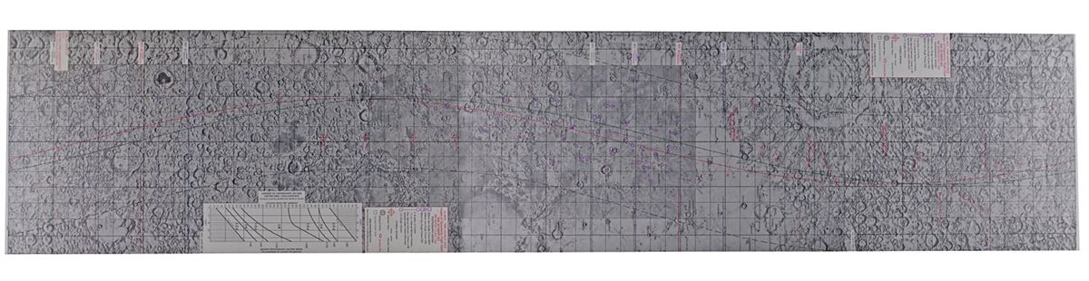 Large original Targets of Opportunity map, 58 x 12, titled along the right side, “14 Nov. 1969 Launch Date, Targets of Opportunity Flight Chart…3rd Edition 23 Oct. 1969,” with a legend underneath listing the types and speeds of the photos to be taken, as well as other reference points, including the Fra Mauro landing site. In fine condition. Rolled.