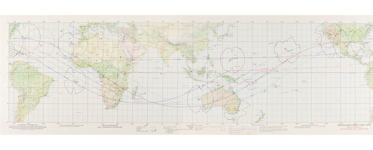 Original first edition Earth Orbit Chart, 41.5 x 13.5, prepared for NASA under the direction of the Department of Defense by the Aeronautical Chart and Information Center, outlining the first two orbits around the Earth by the Apollo 12 spacecraft, as well as the trans-lunar injection, and is labeled in the lower right, “Apollo Earth Orbit Chart (AEO), Apollo Mission 12…For November 1969 Launch Dates,” along with an identification of the sheet number. Accompanied by a two-page article on lunar maps, as well as a two-page explanation of the mission. Rolled and in overall fine condition, with some scattered light creases.