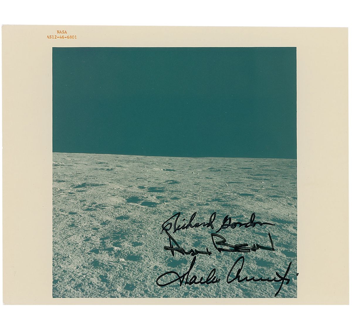 Uncommon official color glossy 10 x 8 ‘red-numbered’ NASA photo of the lunar surface, signed in black felt tip by Richard Gordon, Alan Bean, and Charles Conrad. The photo bears “A Kodak Paper” watermarks on the reverse. In fine condition.