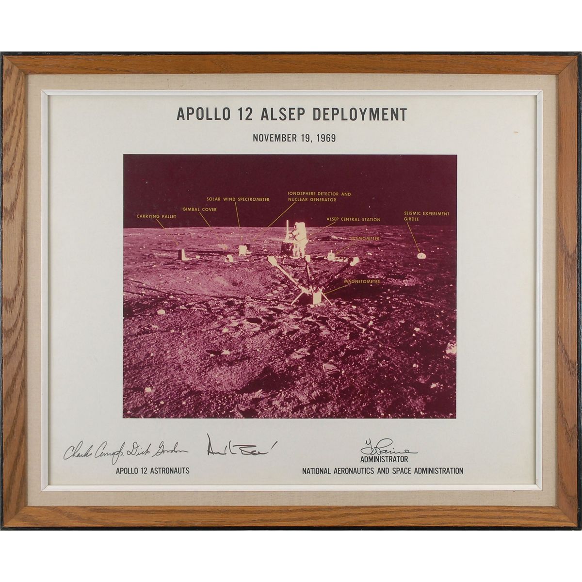 Unusual color satin-finish 13.25 x 10.5 photo of the ALSEP deployment labeled in detail, affixed to a 19.5 x 15.5 mount, signed on the mount in black felt tip by Charles Conrad, Richard Gordon, Alan Bean, and NASA administrator Thomas O. Paine. Cloth-matted and framed to an overall size of 22.75 x 18.75. In fine condition.