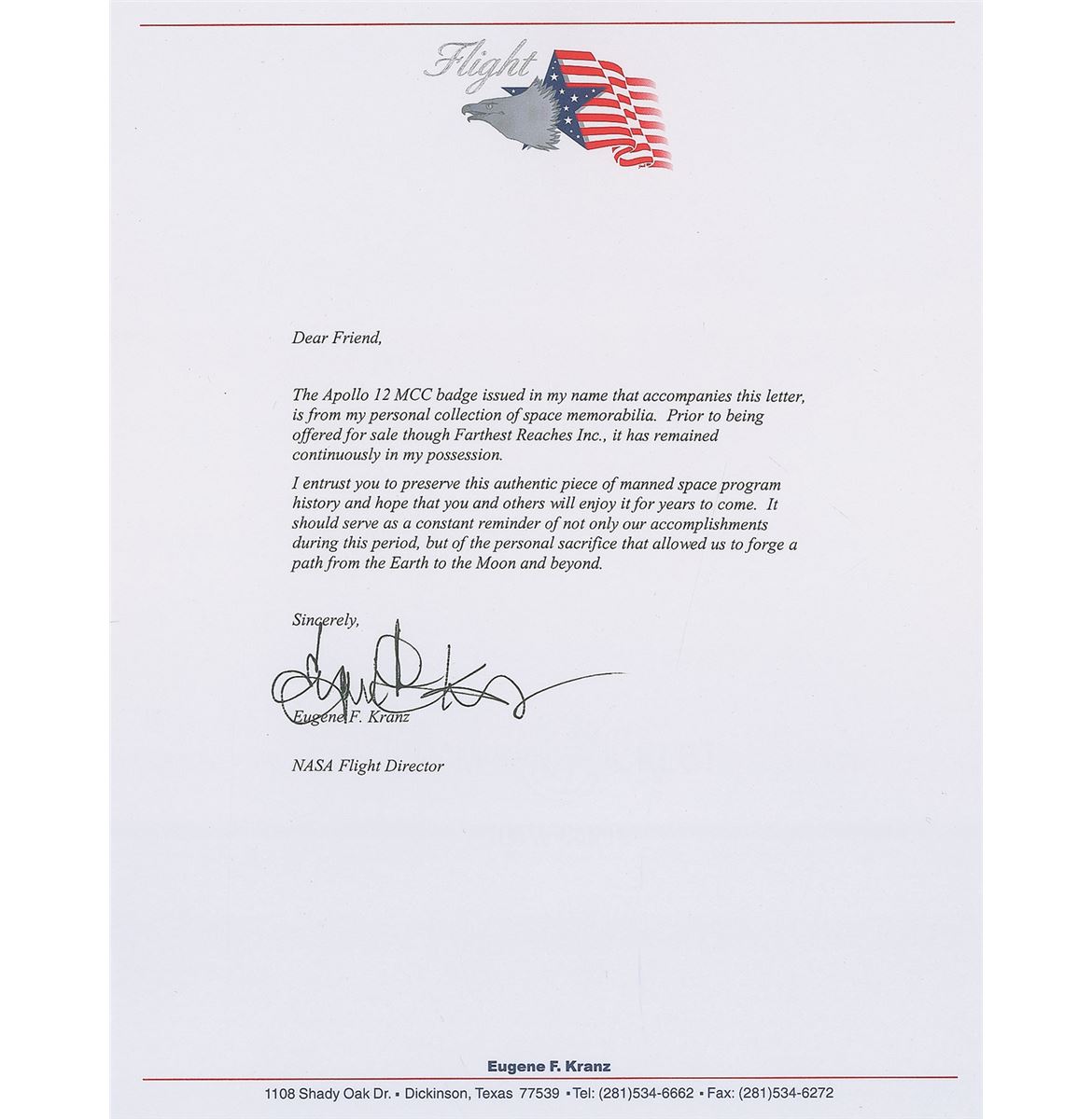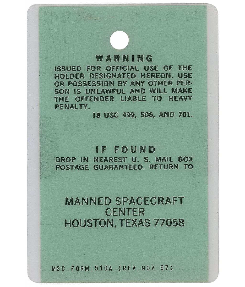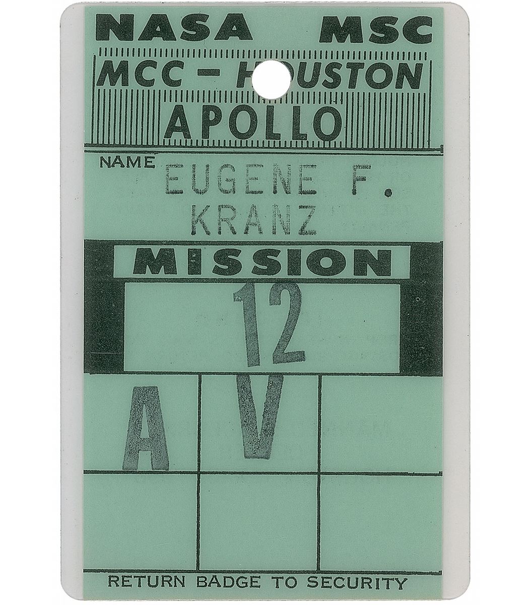 Kranz’s laminated Apollo badge for the NASA Manned Spacecraft Center, Mission Control Center-Houston, 2.5 x 3.75, stamped with his name, “Eugene F. Kranz,” noting the mission as Apollo “12,” with “A” and “V” stamped below. In fine condition, with a punch hole to top. Accompanied by a signed letter of authenticity from Kranz, in part: “The Apollo 12 MCC badge issued in my name that accompanies this letter, is from my personal collection of space memorabilia.” From the Leon Ford Collection.