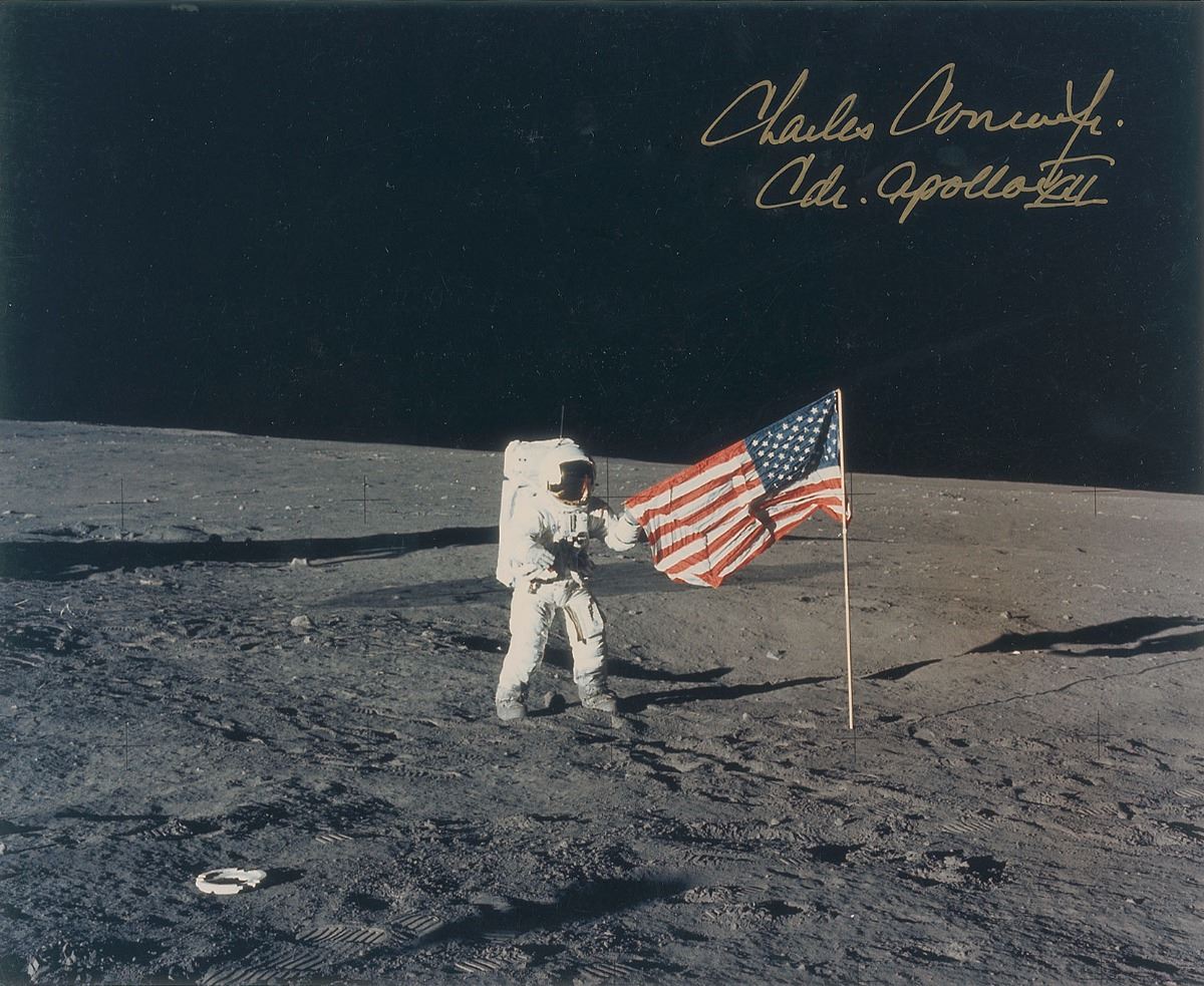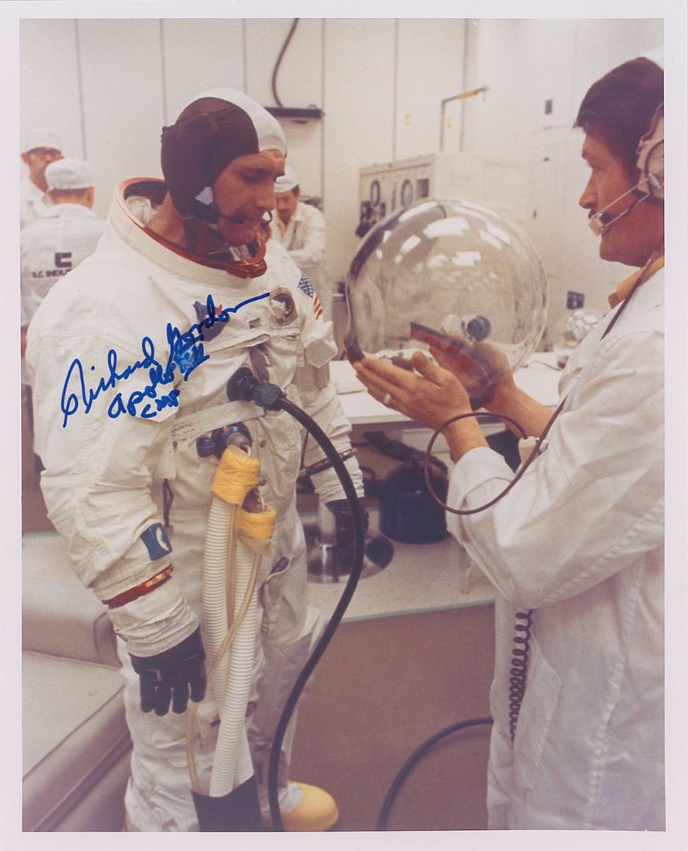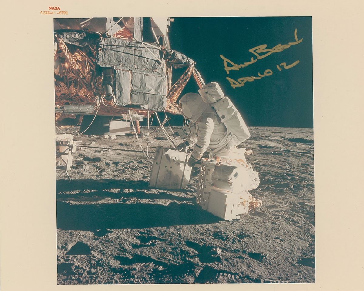 Set of three color photos depicting the prime crew members of Apollo 12, 8 x 10 and 10 x 8, each individually signed in ink or felt tip by Charles Conrad, Alan Bean (red-numbered), and Richard Gordon. In overall fine condition, with a smudge to the mission number in Gordon’s signature. The Leon Ford Collection.