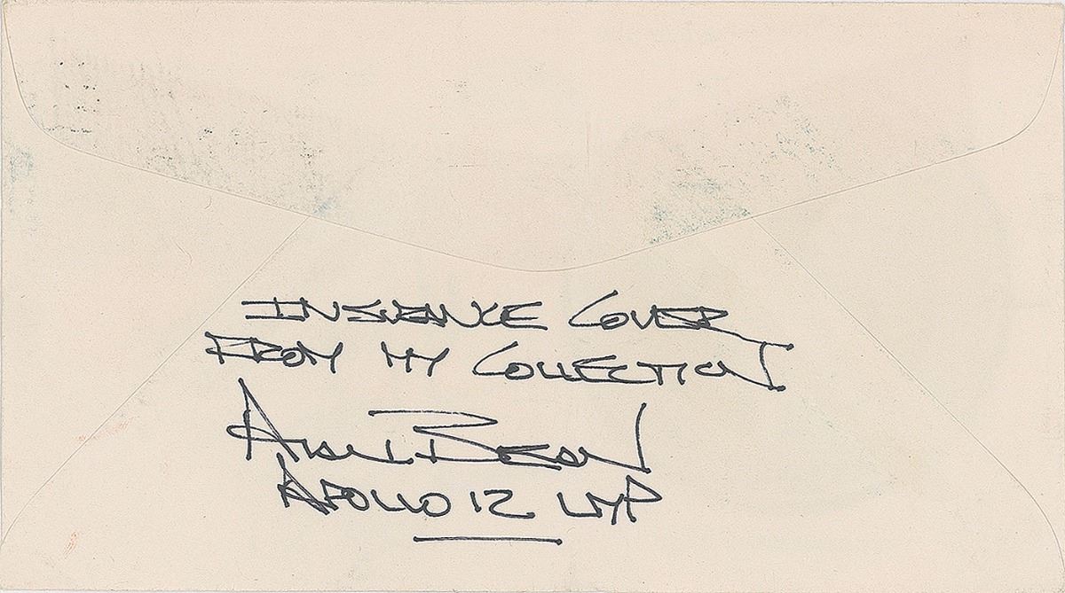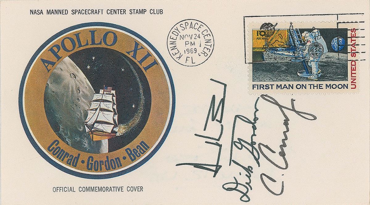 Apollo 12 ‘Type 2’ insurance cover bearing a mission emblem cachet with NASA Manned Spacecraft Center Stamp Club text, postmarked Kennedy Space Center, Florida, November 24, 1969, and signed in black felt tip, “C. Conrad, Jr.,” “Dick Gordon,” and “Alan L. Bean.” Also signed on the reverse in black felt tip, “Insurance cover from my collection, Alan Bean, Apollo 12 LMP.” In fine condition. From the personal collection of Alan Bean.