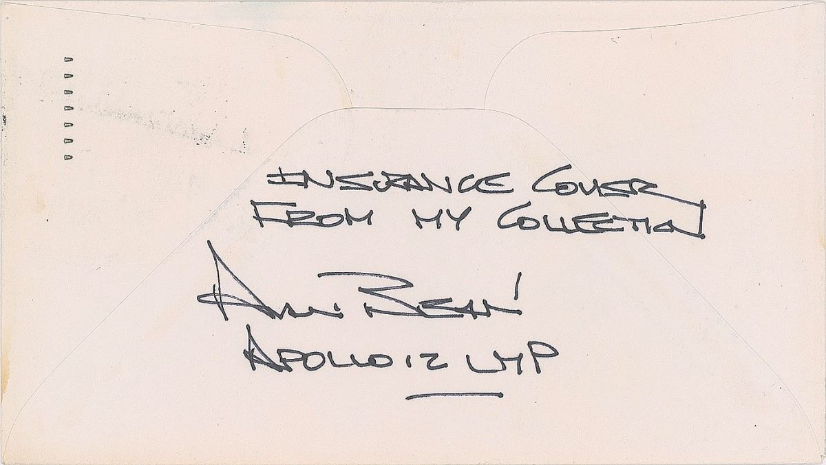 Apollo 12 ‘Type 4’ insurance cover with an emblem cachet honoring the crew and lunar landing, signed in black felt tip by Charles Conrad, Dick Gordon, and Alan Bean. Desirably certified as an insurance cover by LMP Bean in black felt tip on the reverse, “Insurance cover from my personal collection. Alan Bean, Apollo 12 LMP.” In fine condition, with two letters of Conrad’s signature showing one time exposure to moisture. A fantastic fully signed cover from the crew of the second lunar landing.