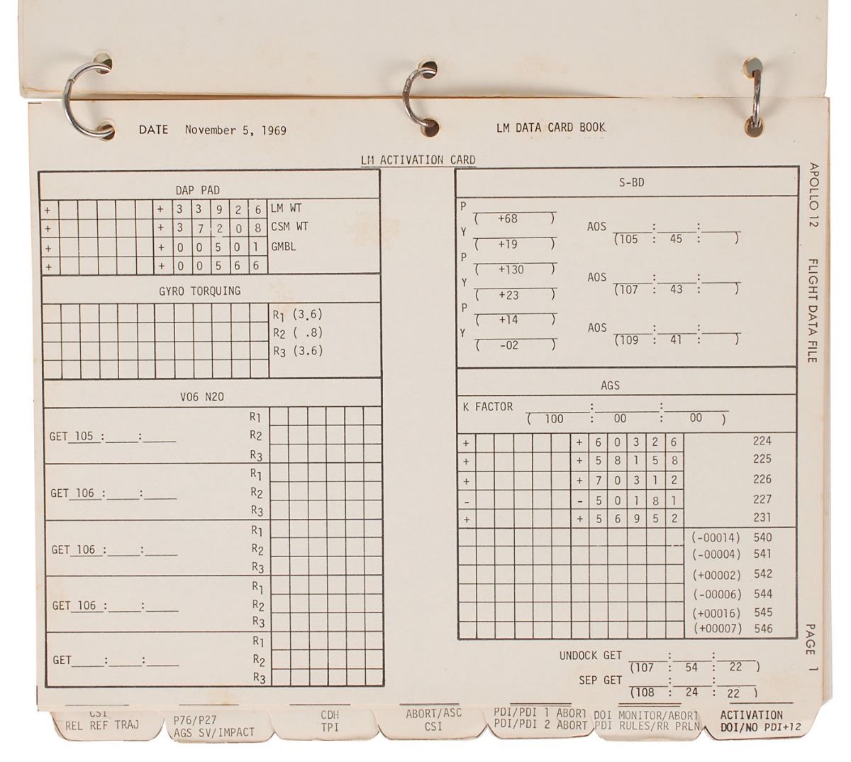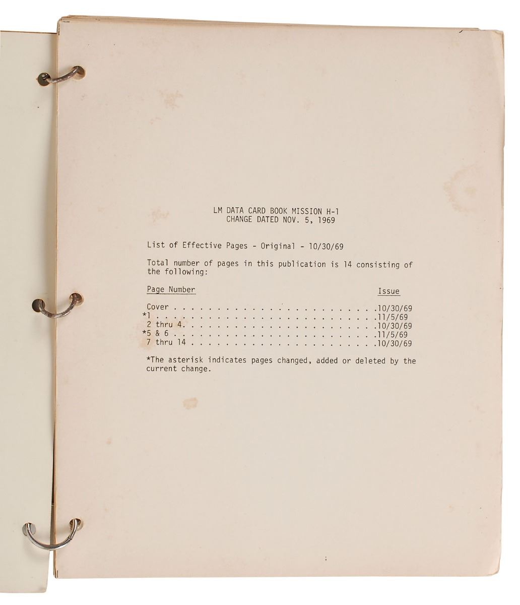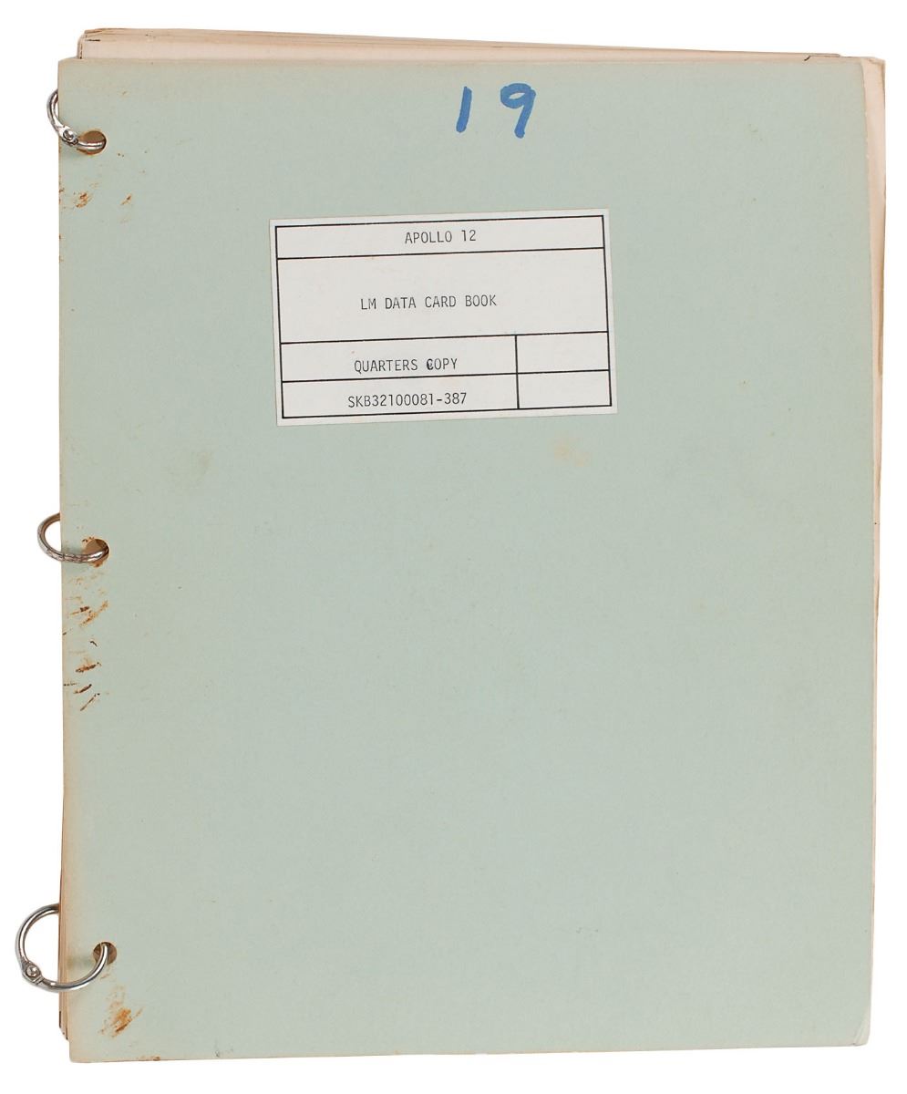 Ring-bound manual used in training, entitled “Apollo 12, LM Data Card Book, Quarter Copy, SKB31200081-387,” fourteen pages, 8.5 x 10.5, featuring various charts, graphs, and tables. Among the labeled tabs are “Activation DOI/NO PDI+12,” “DOI Monitor/Abort, PDI Rules/RR PRLN,” “P76/P27, AGS SV/Impact,” and “CSI REL REF Traj.” In very good to fine condition, with some staining to cover from rust on binder rings.
