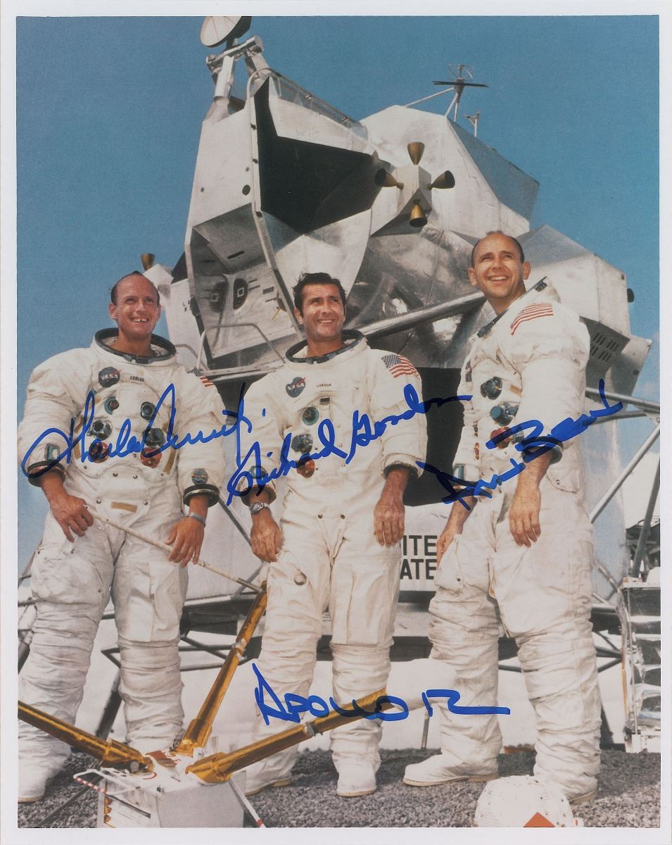 Color satin-finish 8 x 10 photo of the Apollo 12 crew posing in their white space suits, signed in blue felt tip, “Charles Conrad, Jr.,” “Richard Gordon,” and “Alan Bean, Apollo 12.” In fine condition.