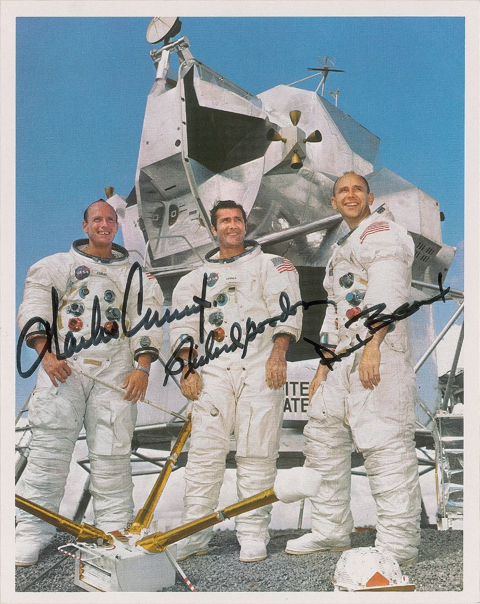Official color 8 x 10 NASA lithograph of the Apollo 12 crew, signed in black felt tip by Alan Bean, Charles Conrad, and Richard Gordon. In fine condition.
