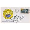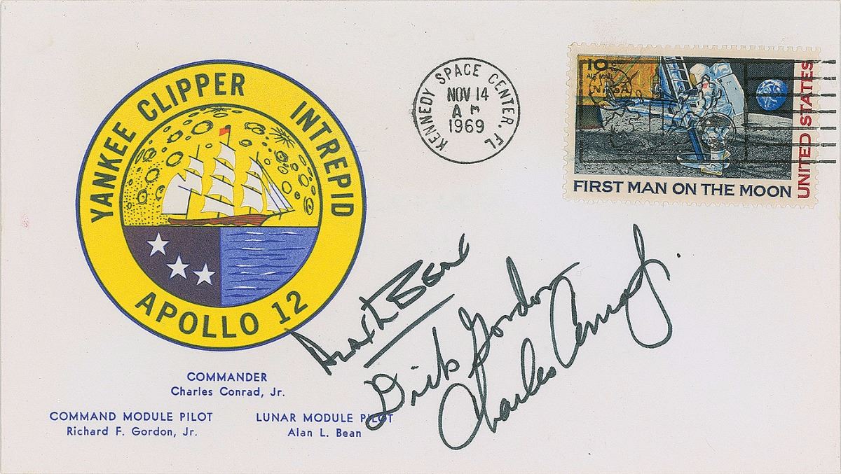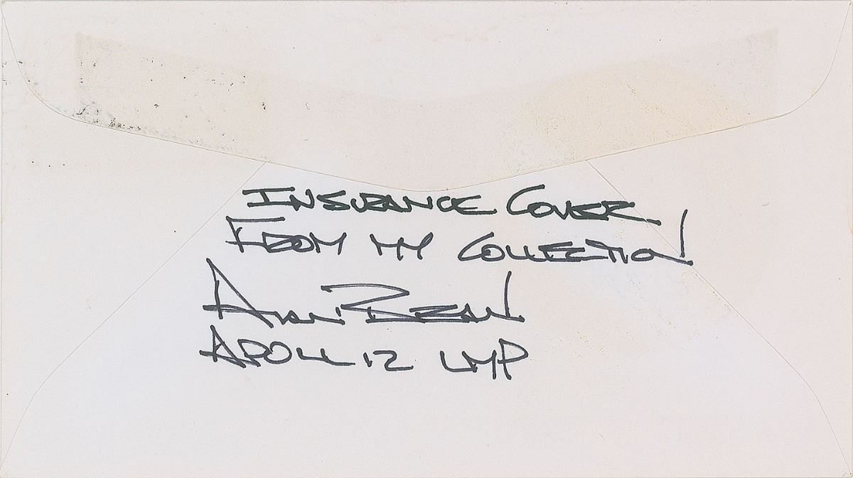 Rare Apollo 12 ‘Type 3’ insurance cover with a cachet showing a Yankee Clipper ship against a lunar background, bearing a November 14, 1969, Kennedy Space Center launch date postmark, signed in black felt tip by Alan Bean, Dick Gordon, and Charles Conrad. Notation on the reverse in Bean’s hand reads, “Insurance cover from my collection, Apollo 12 LMP.” In fine condition. An attractive cover produced only in very small quantities, with excellent provenance from the mission’s Lunar Module Pilot.