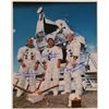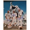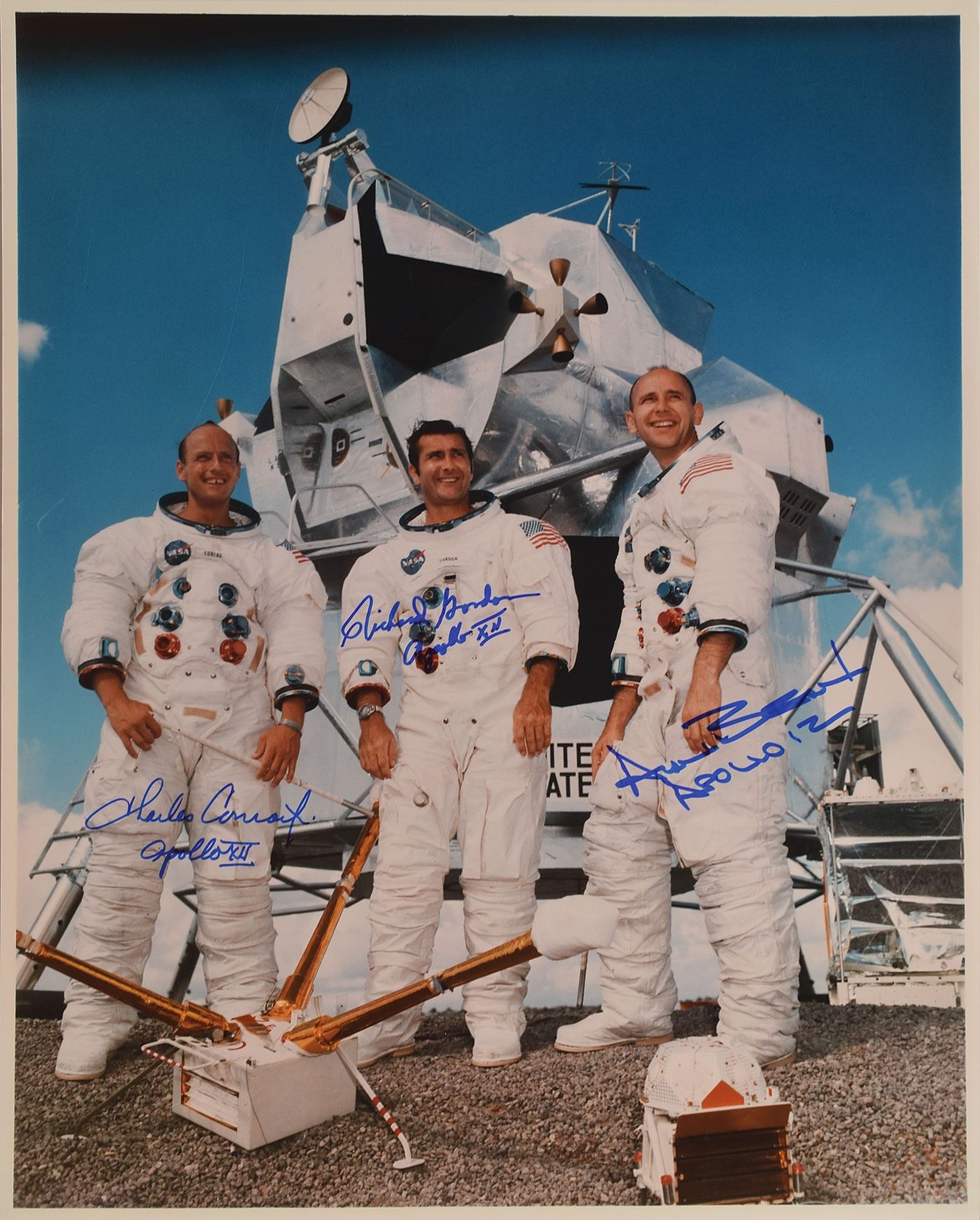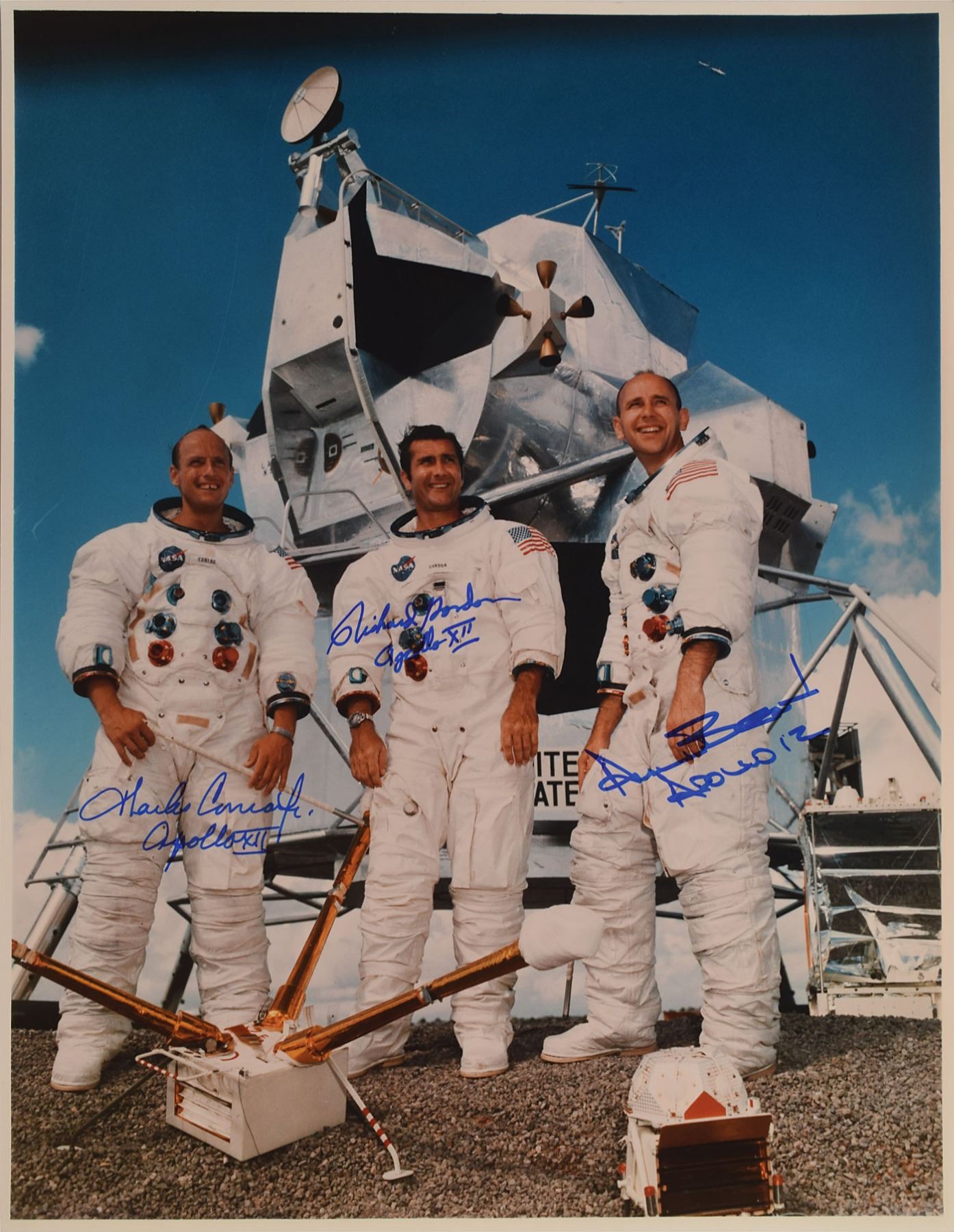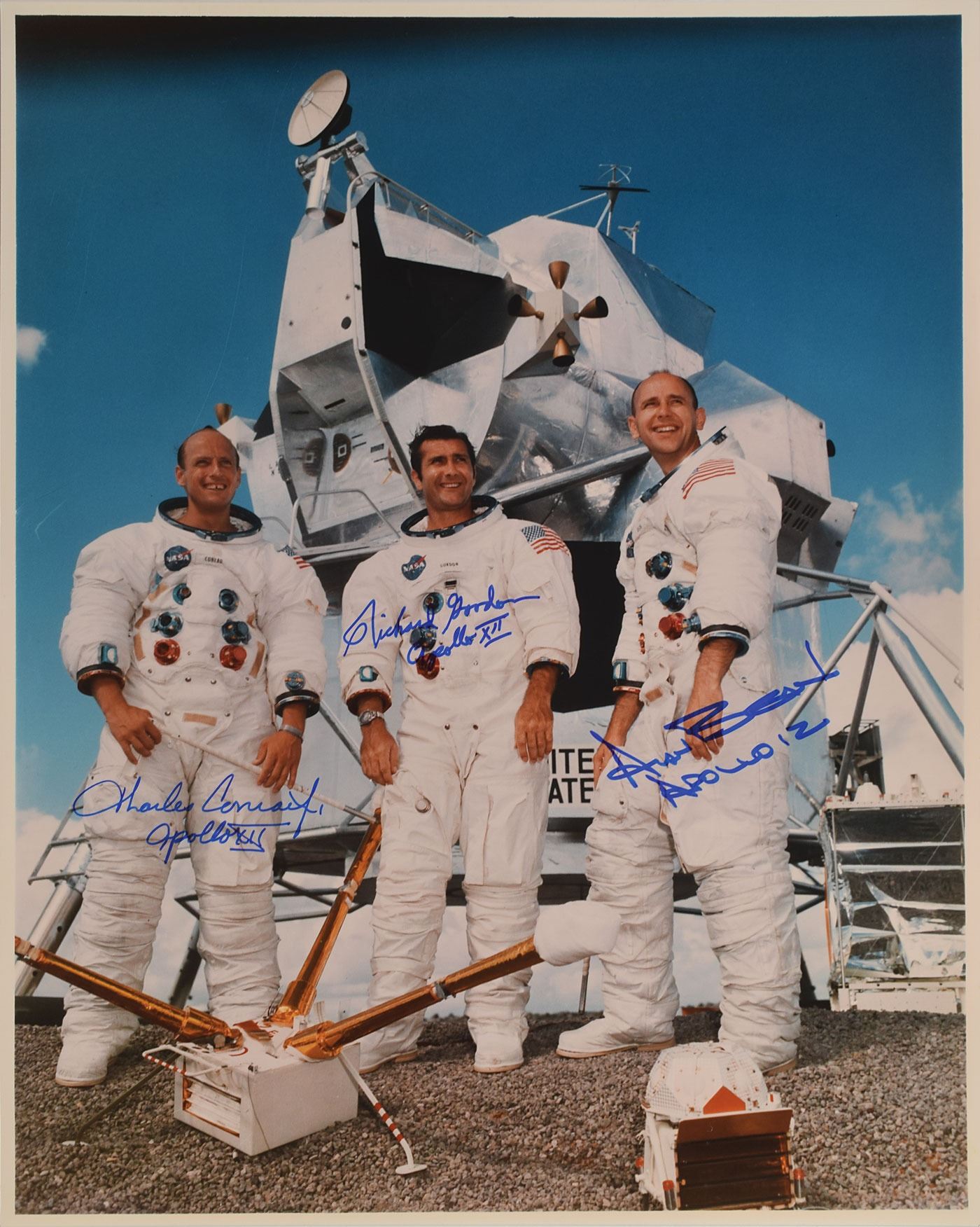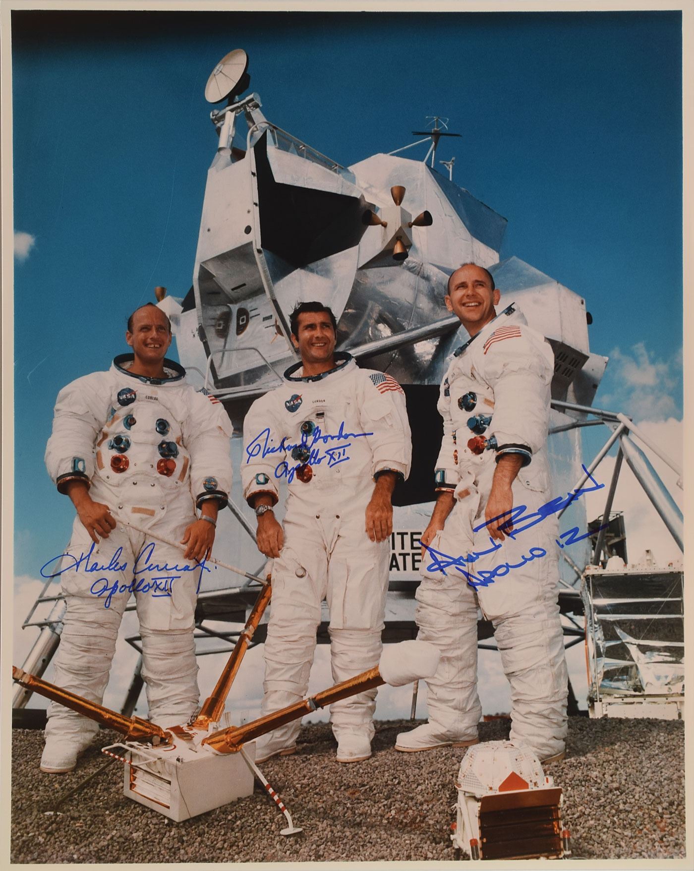 Identical set of four color semi-glossy 16 x 20 photos of the crew of Apollo 12 posing in their white space suits in front of the lunar module, each signed in blue felt tip, "Charles Conrad, Jr., Apollo XII," "Richard Gordon, Apollo XII," and "Alan Bean, Apollo 12." In overall fine condition.
