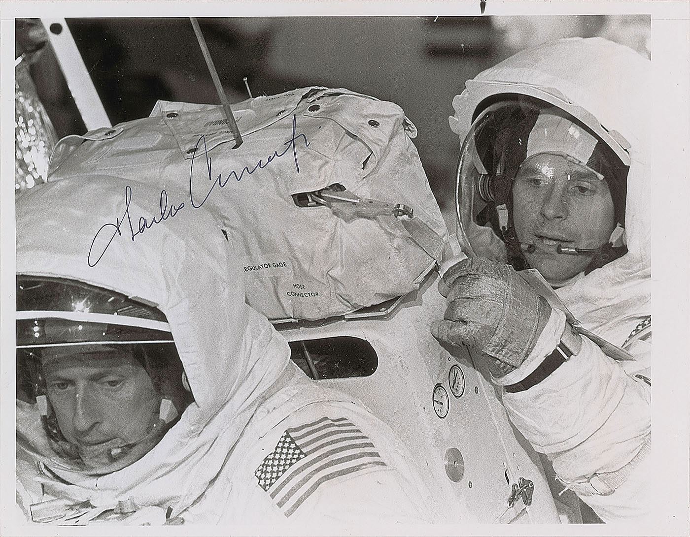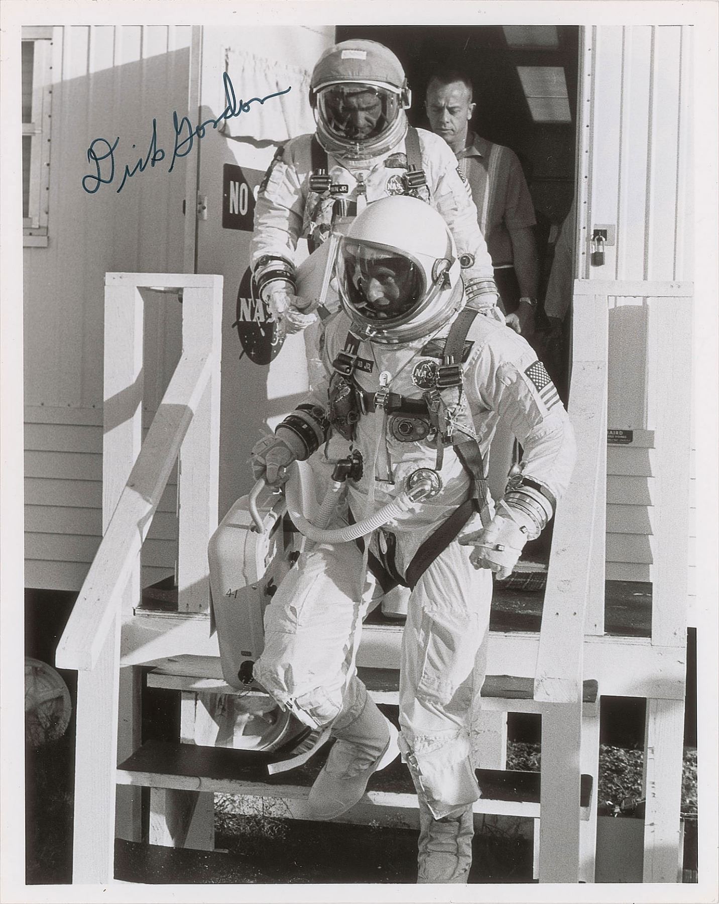 Two official glossy NASA photos: one 10 x 8 photo of Alan Bean adjusting Charles Conrad's PLSS during an EVA rehearsal exercise, signed in black felt tip, "Charles Conrad, Jr."; and one 8 x 10 photo of Conrad with Richard Gordon before their Gemini 11 mission, signed in black felt tip, "Dick Gordon." Both bear purple NASA caption text on the reverse. In overall fine condition.