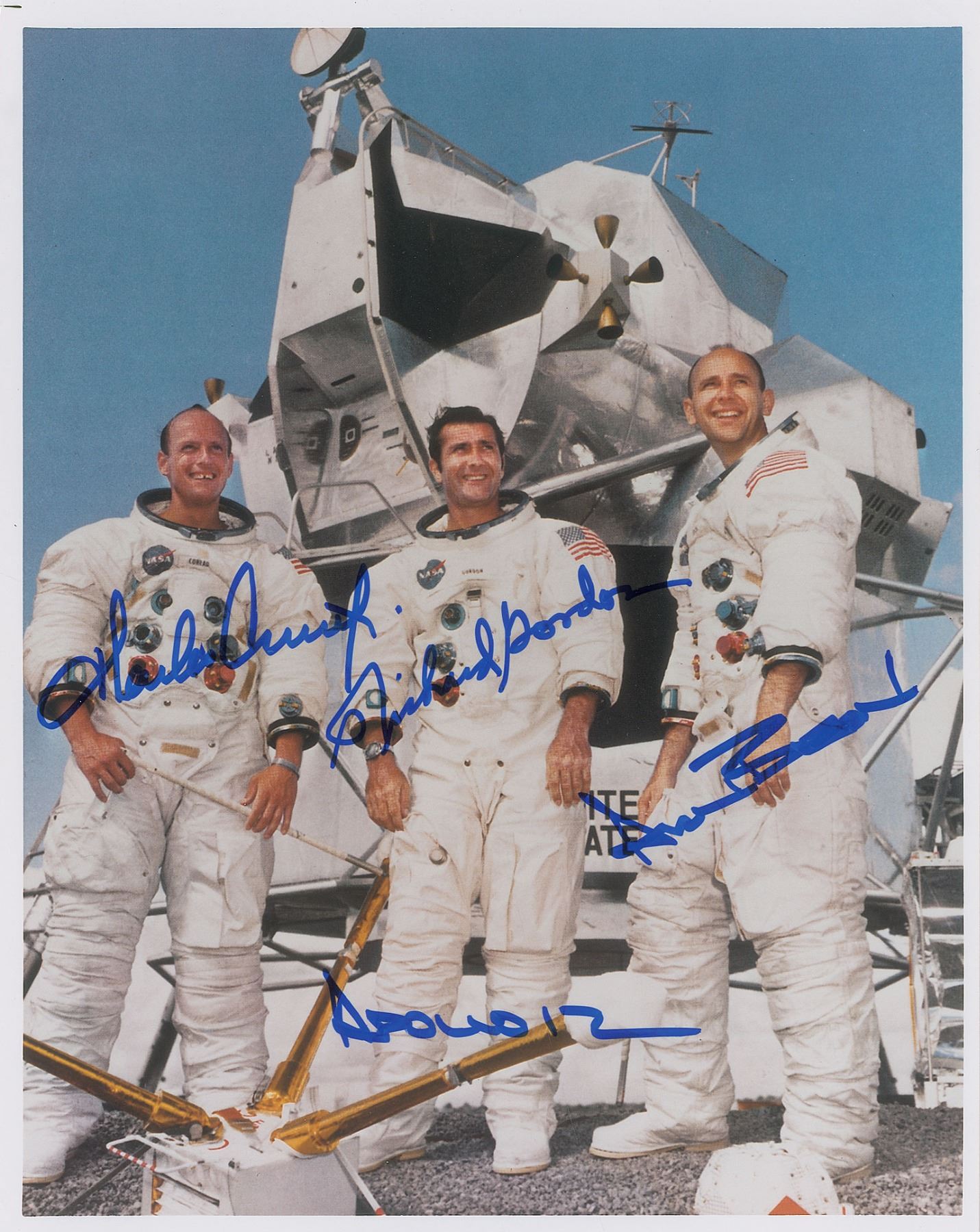 Color semi-glossy 8 x 10 photo of the Apollo 12 crew posing in their white space suits in front of the lunar module Intrepid, signed in blue felt tip by Charles Conrad, Richard Gordon, and Alan Bean, who adds "Apollo 12." In very fine condition.