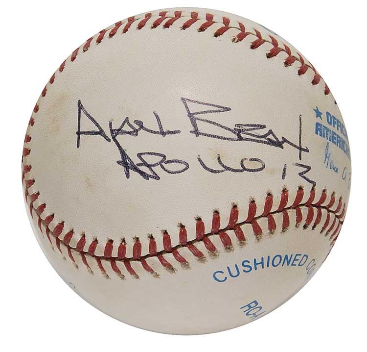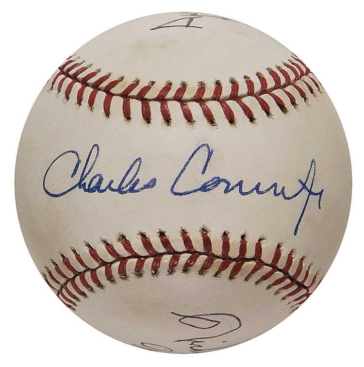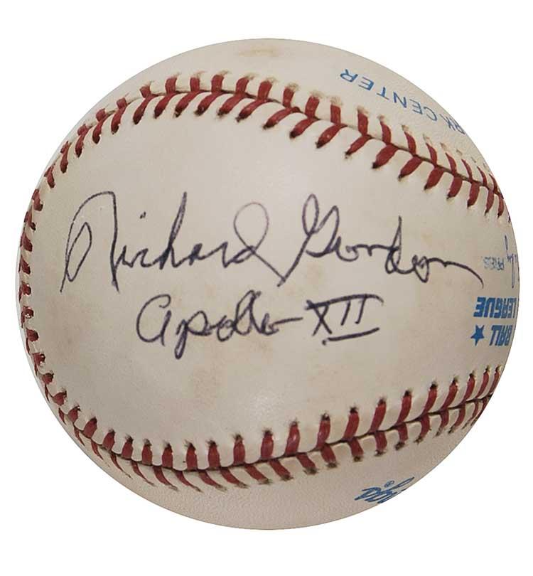 Official Rawlings American League baseball signed in blue ballpoint on the sweet spot by Charles Conrad, and in black ballpoint on the side panels by Alan Bean and Dick Gordon, both adding their mission underneath. Some scattered light toning and soiling, otherwise fine condition. Pre-certified Scott Cornish and RRAuction COA.