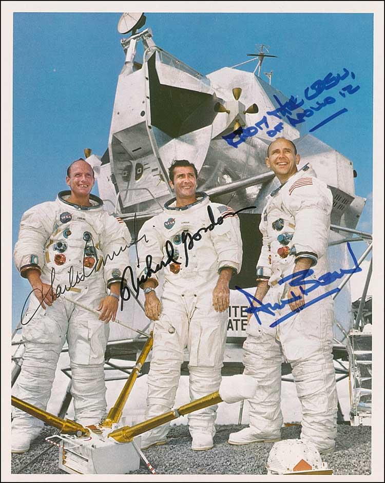 Color 8 x 10 NASA photo of three Apollo 12 astronauts standing in front of the lunar module, signed in black ink by Charles Conrad, in black felt tip by Richard Gordon, and in blue felt tip by Alan Bean, adding “From the Crew of Apollo 12.” In fine condition, with a trivial corner ding to upper left edge. Pre-certified Scott Cornish and RRAuction COA.