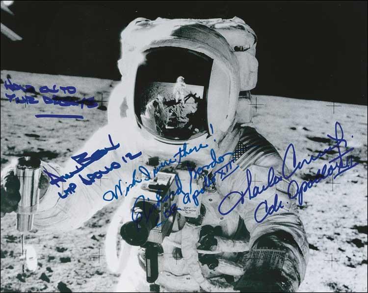 Satin-finish 10 x 8 photo close-up photo of Alan Bean on the lunar surface, signed in blue felt tip by Conrad, Gordan, and Bean, each adding their mission and assignment under their respective signatures. In fine condition. Pre-certified Scott Cornish and RRAuction COA.