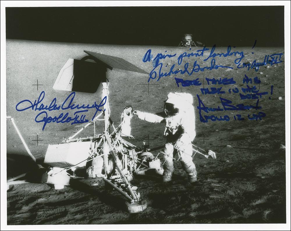Satin-finish 10 x 8 photo of Conrad working on the lunar surface, signed in blue felt tip, “Charles Conrad, Apollo XII,” “A pin pinpoint landing! Richard Gordon, CMP Apollo XII,” and “Pete makes his mark in the dust! Alan Bean, Apollo 12 LMP.” A slight brush to Gordon’s sentiment, otherwise very fine condition. Pre-certified Scott Cornish and RRAuction COA.
