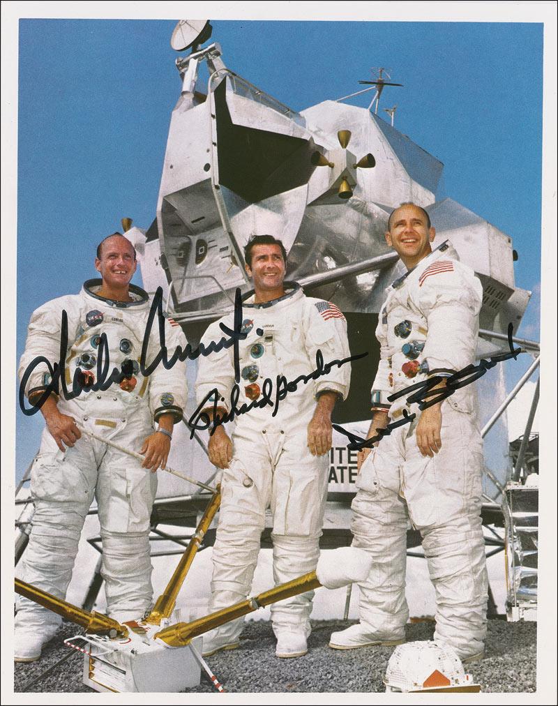 Color 8 x 10 NASA photo of the Apollo 12 crew posing together in their space suits during training, signed in black felt tip by Charles Conrad, Richard Gordon, and Alan Bean. A few trivial surface bends, otherwise very fine condition. Pre-certified Scott Cornish and RRAuction COA.