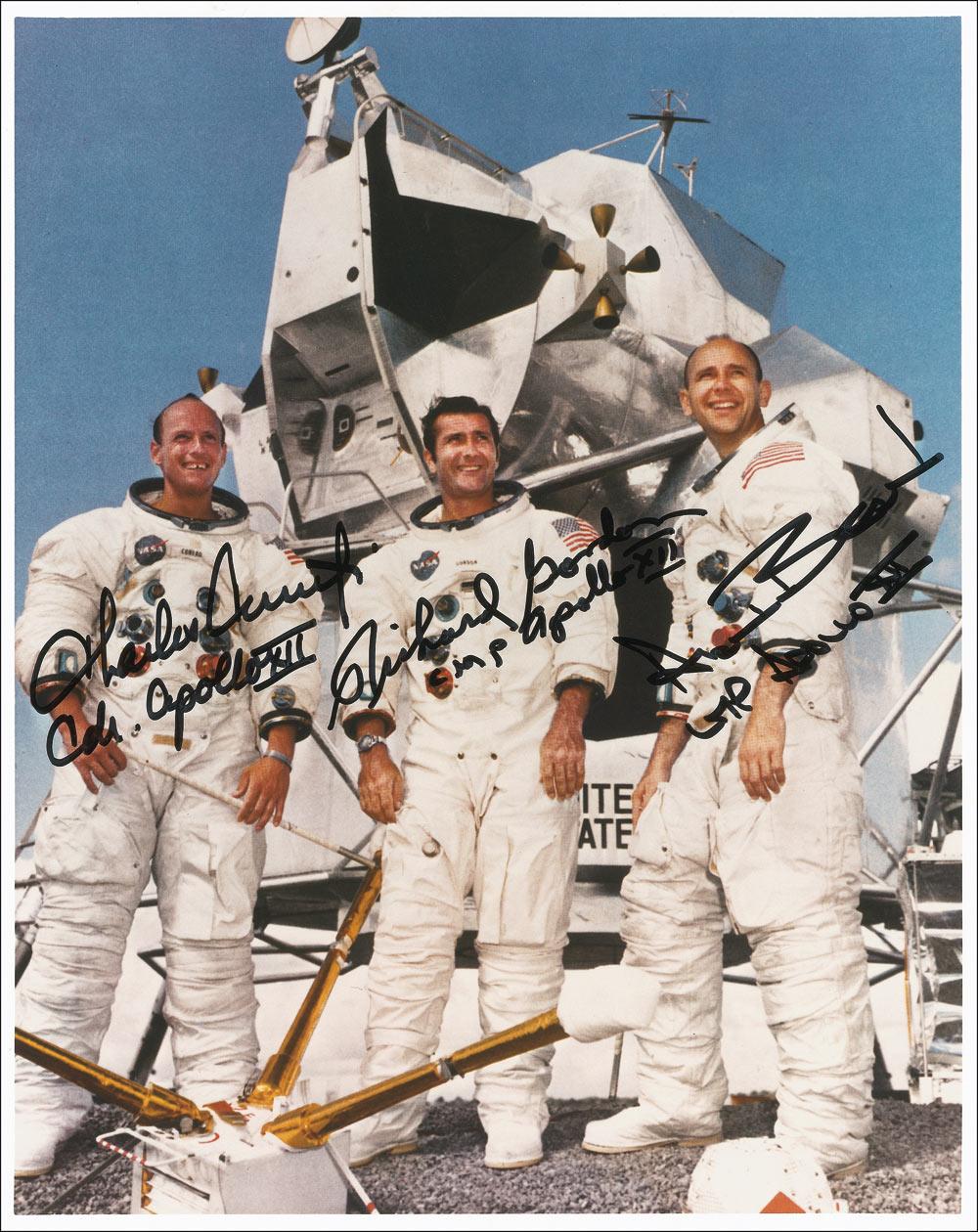 Color satin-finish 8 x 10 photo of the Apollo 12 crew posing beside their lunar lander during training, signed in black felt tip by Charles Conrad, Alan Bean, and Richard Gordon, each adding their flight assignments under their signatures. In very fine condition. Collector’s label on reverse notes “Signed in person [at a collector’s convention in Burbank, CA] for Congressman Rogan by astronauts Conrad, Gordon and Bean, June 27, 1999.” This item was signed only eleven days before Conrad died in an unfortunate motorcycle accident on July 8, 1999. Pre-certified Scott Cornish and RRAuction COA.