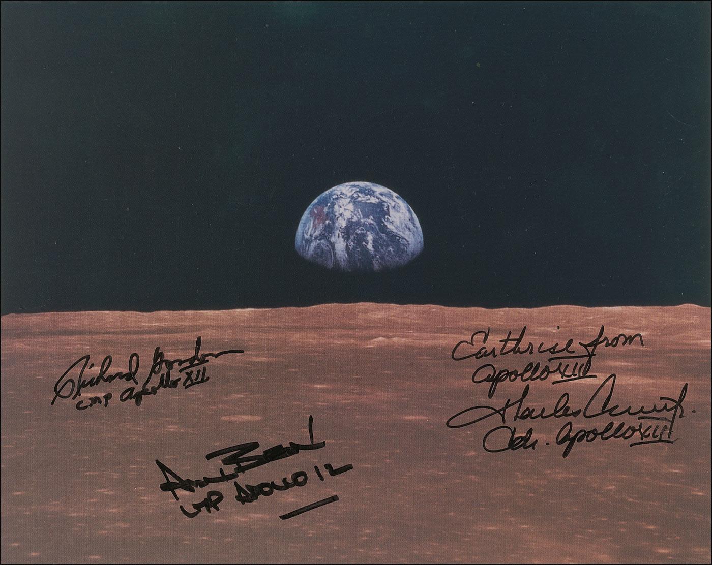 Breath-taking color satin-finish 10 x 8 photo of the Earthrise taken from the moon, signed in black felt tip, “Earthrise from Apollo XII, Charles Conrad, Jr., Cdr. Apollo XII,” “Alan Bean LMP Apollo 12,” and “Richard Gordon CMP Apollo XII.” In very fine condition.