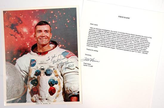 Apollo 13, 1970, Fred Haise Autographs. Lot of two different including on 1) a NASA 8x10" color lithograph of him in his white space suit. He has inscribed it: "To John, Best Wishes" and on 2) an undated typed letter discussing the causes of the Apollo 13 oxygen tank explosion in space. An attrtactive pair.