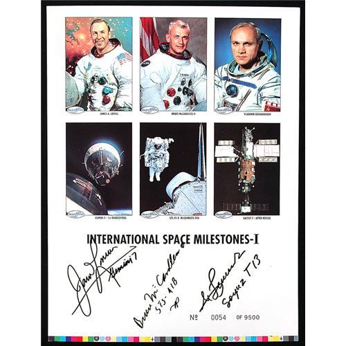 <Our item number 139866><B>Apollo 13, 1970, Lovell, McCandless & Dzhanibekov Autographs.</B> Signed on the bottom on an International Space Milestones - 1 uncut sheet of SpaceShot trading cards. The cards themselves are numbered 001-006 on the reverse and the sheet is numbered 0054 of 9500. Each astronaut has marked one of his flights beneath his autograph. Minor edge faults, but these sheets are unissued as such and are quite rare. <BR>Estimated Value $250 - 350. <I><BR>Ex. the Ed White Family collection.</I> <BR><BR>Our item number 139866<BR><IMAGES><P ALIGN="CENTER"><IMG SRC="http://www.goldbergcoins.net/liveauction/49jpegs/139866.jpg"> </P></IMAGES>