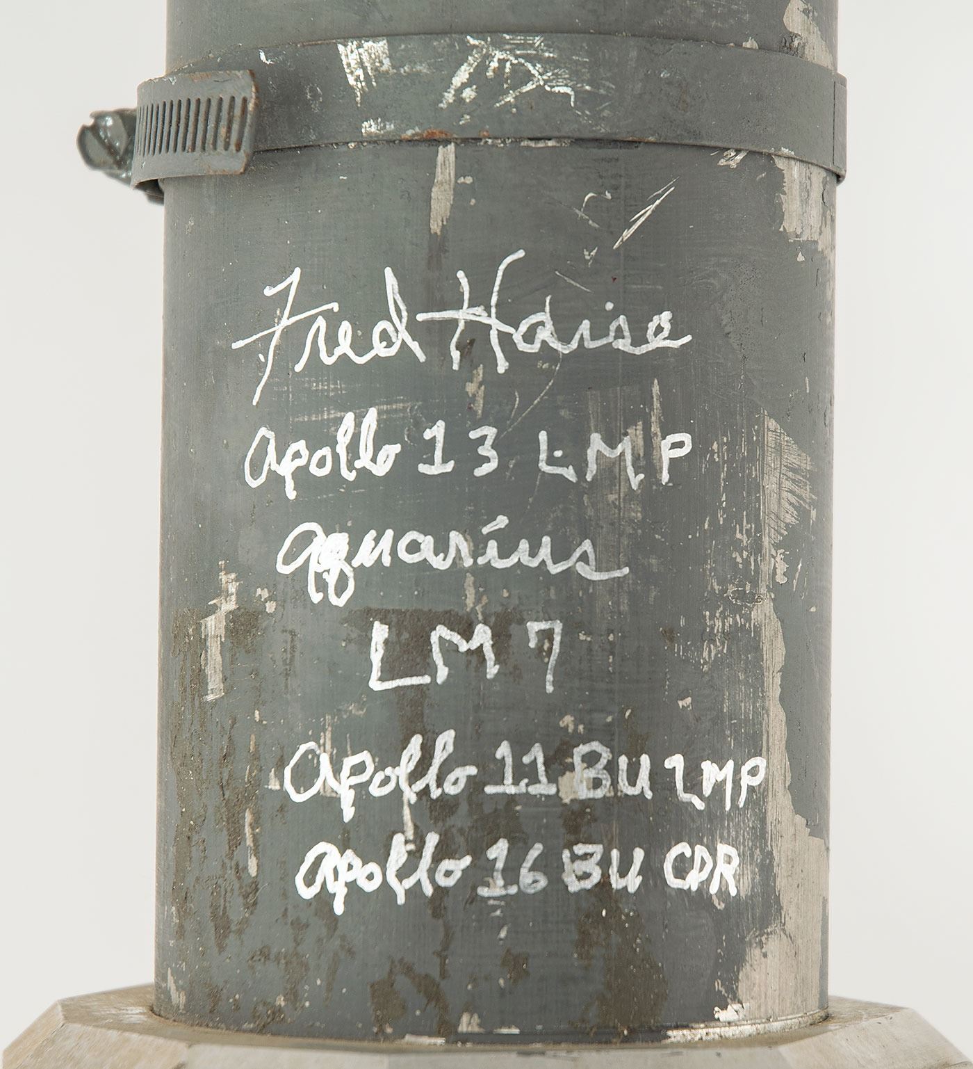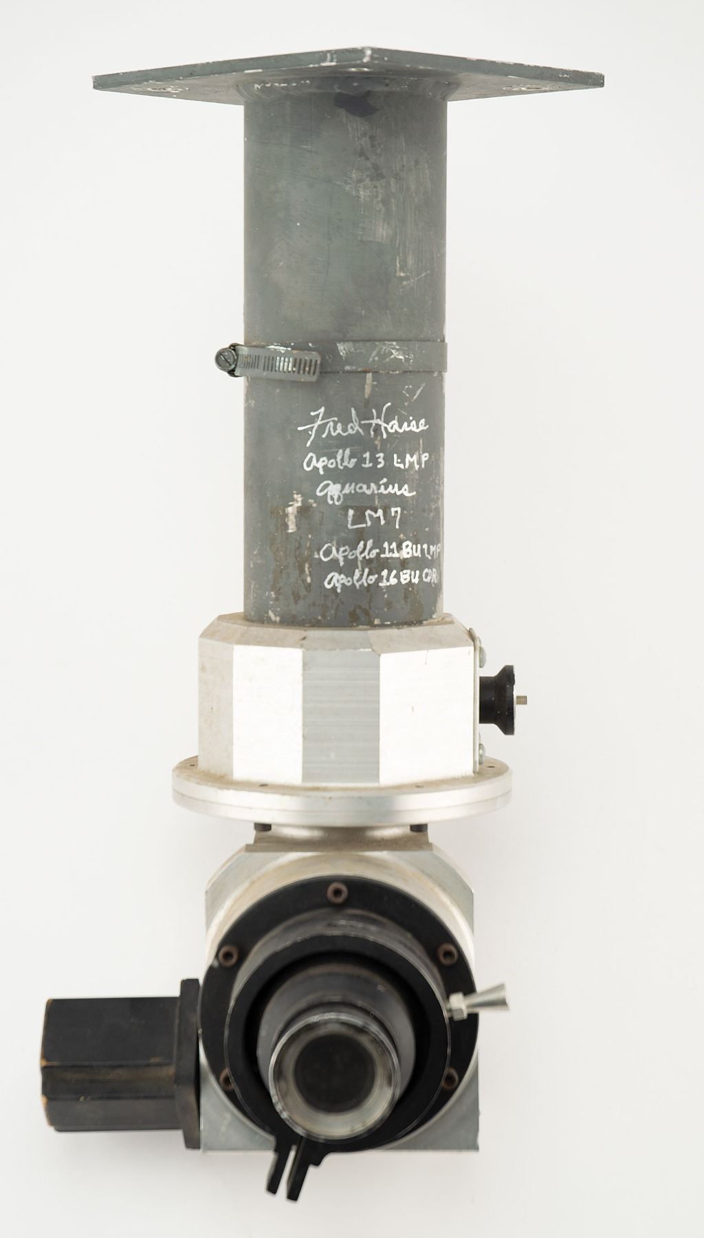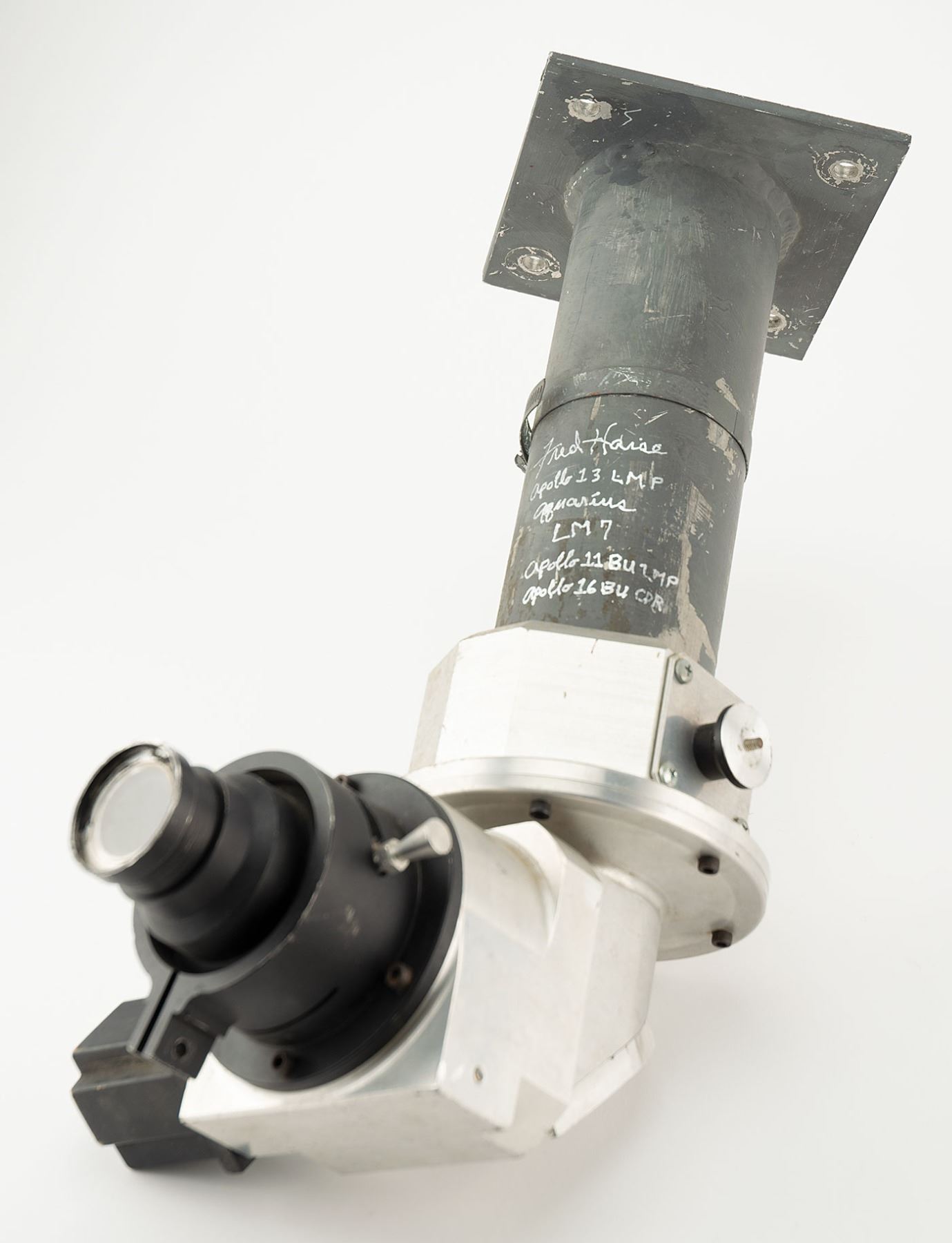 Outstanding screen-used Lunar Module Alignment Optical Telescope (AOT) prop from the Oscar-winning 1995 film Apollo 13, standing approximately 18˝ in height and weighing 17 pounds. The periscope-type device is made of aluminum, brass, resin, and steel, and is signed on the gray base pole in silver ink, "Fred Haise, Apollo 13 LMP, Aquarius, LM7, Apollo 11 BU LMP, Apollo 16 BU CDR." In fine condition. The AOT was a periscope-type optical device that protruded through the top of the Lunar Module. Astronauts used the AOT to make direct visual sightings and record precise angular measurements of pairs of celestial objects. This information was transferred to the Module's guidance computer, which determined the spacecraft's attitude and permitted the alignment of its inertial guidance system. Accompanied by images of the prop as seen in the film, as well as a signed letter of authenticity from spaceflight historian and author Lora Johnson, which reads, in part: "This screen-used item was part of the lunar module interior set during production of the Tom Hanks film Apollo 13. When the set later was refurbished for use in the HBO mini-series From the Earth to the Moon, many original components that had been broken or worn were removed and replaced. This heavily built…(AOT) was replaced by one of lighter construction…After filming wrapped, it was given to [Johnson] by Go Flight, Inc., and the FTETTM art department as a thank you for her assistance as design consultant."