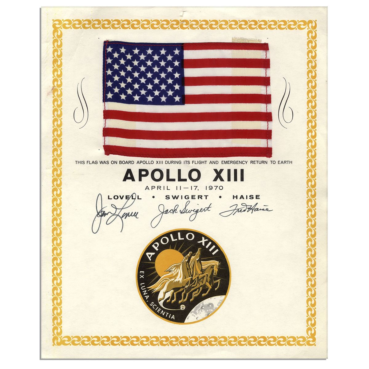 American flag flown aboard the near-disastrous Apollo 13 mission to the moon. Printed 6'' x 4'' fabric flag accompanied the astronauts on the Apollo 13 mission, the third of the Apollo lunar missions, that was aborted after an oxygen tank exploded, though each of the astronauts returned safely to earth. Flag is affixed to an official NASA certificate with the Apollo 13 printed insignia and reading: ''This flag was on board Apollo XIII during its flight and Emergency Return to Earth.'' Certificate is signed, ''Jim Lovell'', ''Jack Swigert'' and ''Fred Haise''. Certificate measures 10'' x 12'' and has a small .5'' enclosed tear to top edge and minor creasing to upper left corner. Some tape showthrough behind flag, else very good to near fine overall. With an LOA from Jack Swigert's sister.