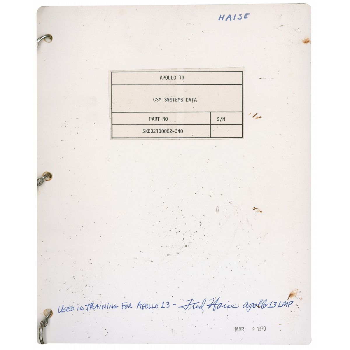 Fred Haise’s used Apollo 13 CSM Systems Data manual, 8.5 x 10.5, dated March 9, 1970. At over 46 pages in length, manual contains numerous tabbed folding diagrams and schematics, and is bound with three metal rings. Accompanied by a 2009 letter of authenticity from Fred Haise stating, in part: “This Apollo 13 CSM Systems Data book with thirty-nine pages of schematics and diagrams describing the operation of the Command/Service Module (CSM) was provided to me as a training reference prior to the liftoff of Apollo 13 to the Moon. A CSM Systems Data book has schematics that describe the inner workings of the spacecraft in the event of a system failure such as the many we endured during our mission. During the Apollo Program, NASA’s policy allowed astronauts to keep training manuals and equipment from their mission preparation as personal mementos, and I accordingly chose to include the CSM Systems Data book among mine. This CSM Systems DATA book has remained a treasured part of my personal space collection for forty years.”