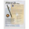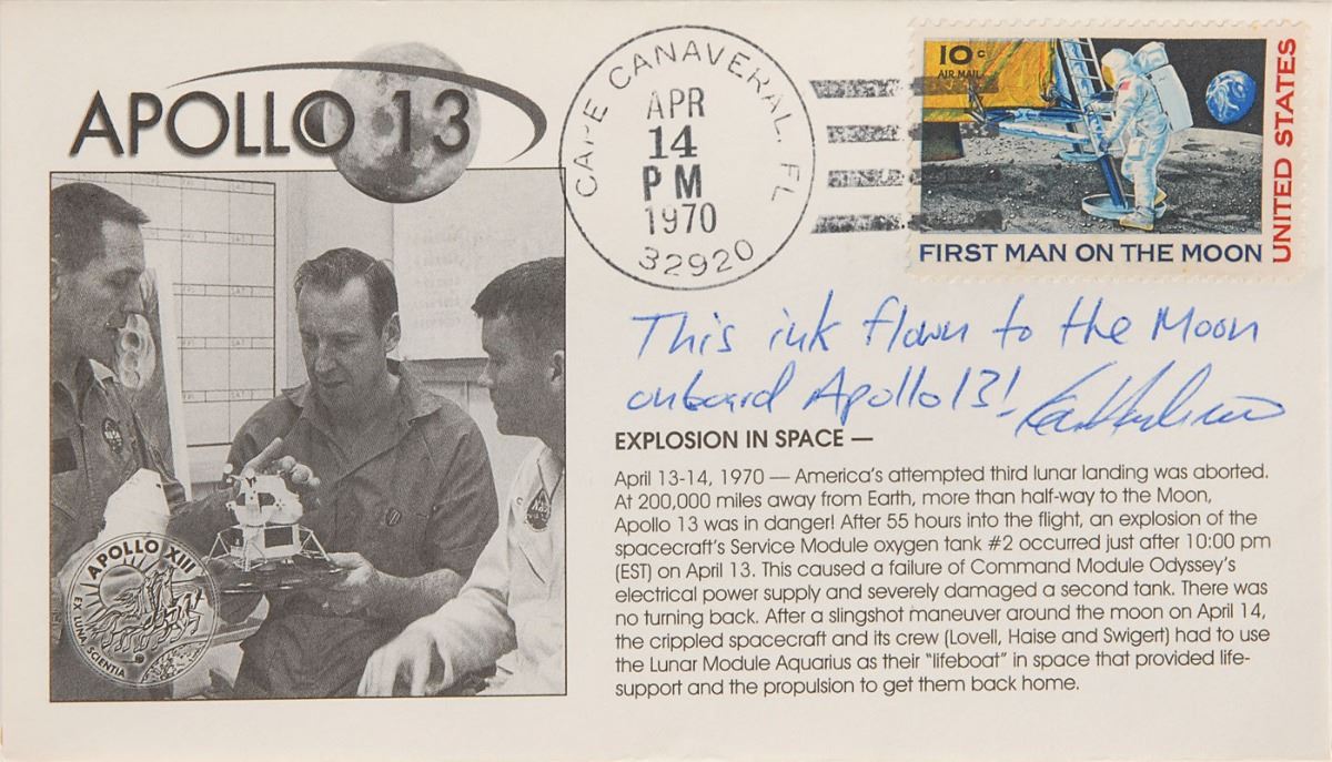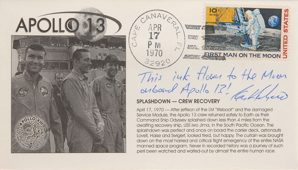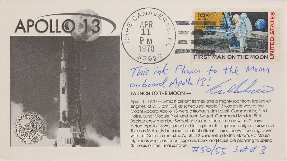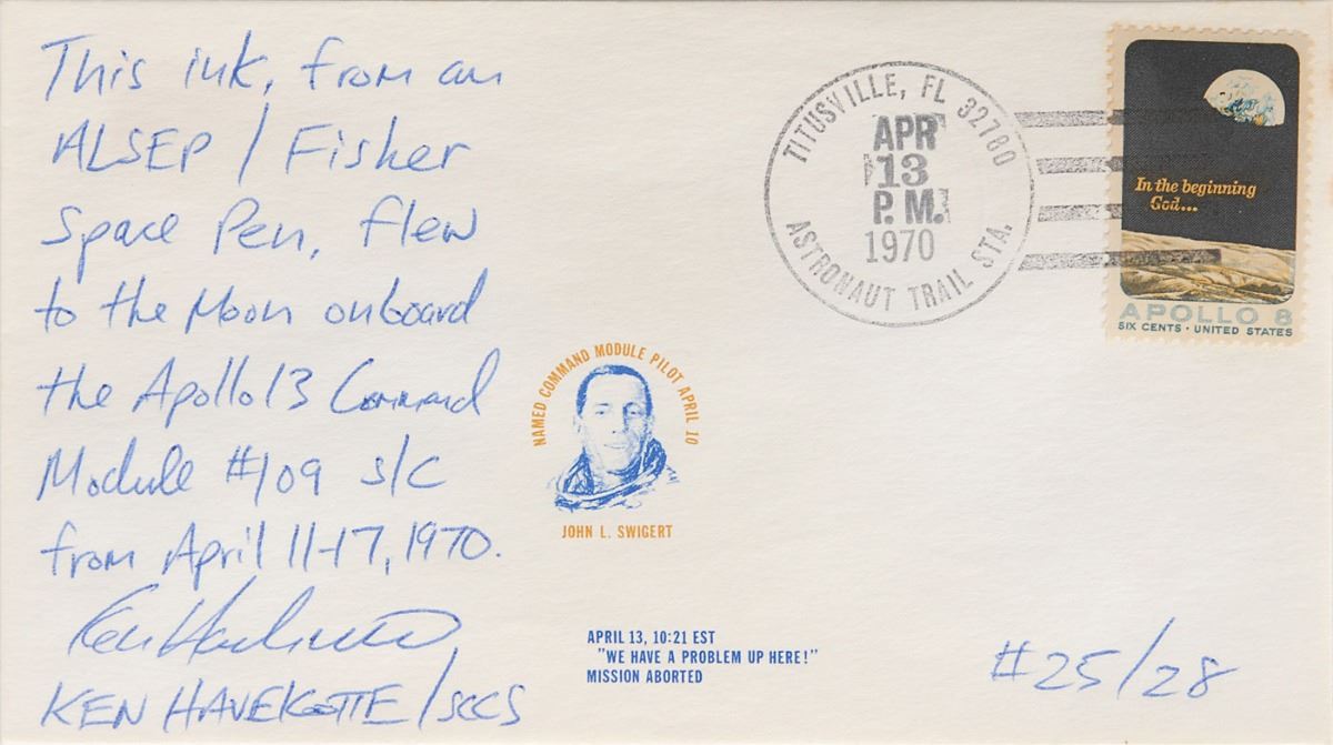 Collection of four limited edition covers with ink notations made by Ken Havekotte using a Fisher Space Pen flown on Apollo 13: one featuring a cachet of Jack Swigert, numbered 25/28, with the writing: “This ink from and ALSEP/Fisher Space Pen, flew to the Moon onboard the Apollo 13 Command Module #109 S/C from April 11–17, 1970”; and a set of three Apollo 13 covers honoring specific dates during the mission, numbered 50/55, each notated, “This ink flown to the Moon onboard Apollo 13!” Also includes a certificate of authenticity signed in the same ink. In overall fine condition. From the collection of aerospace memorabilia specialist Ken Havekotte.