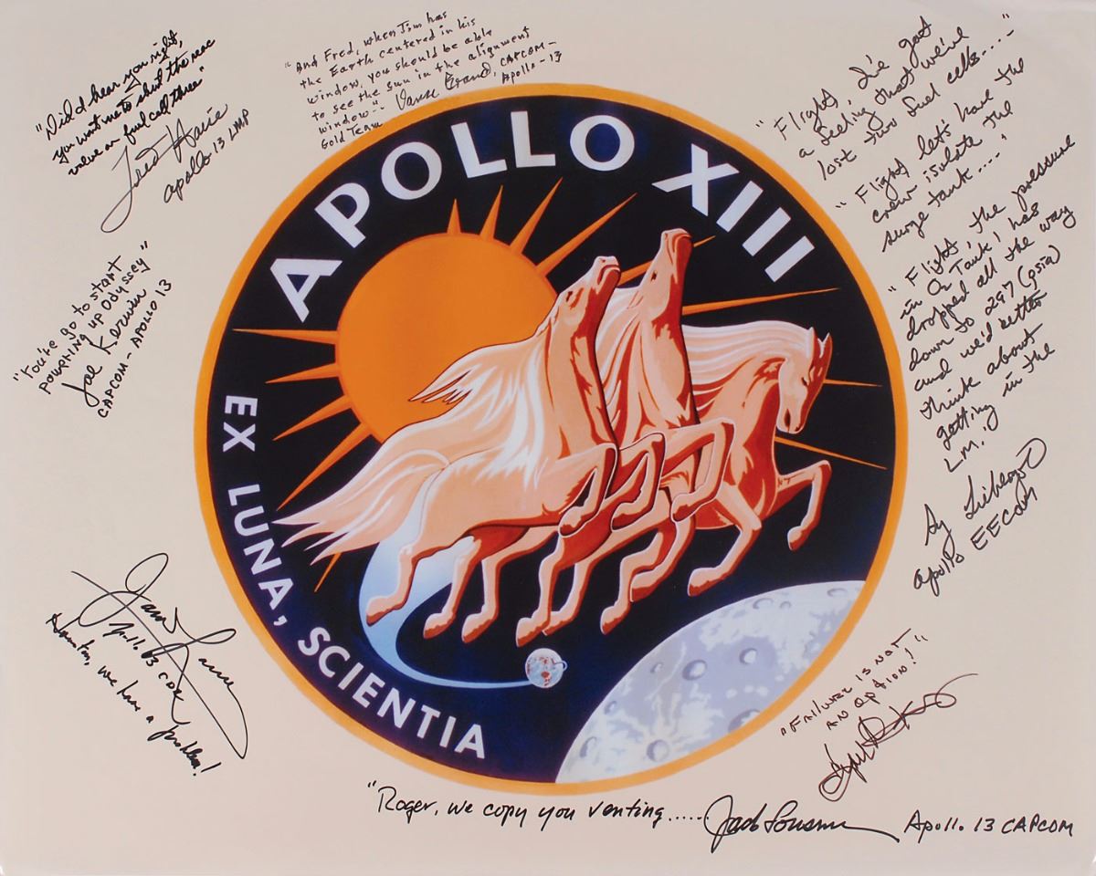 One-of-a-kind color satin-finish 20 x 16 photo of the Apollo 13 mission insignia, signed in black felt tip by seven members of the flight crew and mission control, including: “James Lovell, Apollo 13 CDR, Houston, we have a problem!,” “‘Did I hear right, you want me to shut the rear valve on fuel cell three,’ Fred Haise, Apollo 13 LMP,” “‘You’re go to start powering up Odyssey,’ Joe Kerwin, CAPCOM—Apollo 13,” “‘And Fred, when Jim has Earth centered in his window, you should be able to see the sun in the alignment window.’ Vance Brand, Gold Team, CAPCOM—Apollo–13,” “‘Roger, we copy you venting…Jack Lousma, Apollo 13 CAPCOM,” “‘Failure is not an option!’ Eugene F. Kranz,” and “‘Flight, I’ve got a feeling that we’ve lost two fuel cells…,’ ‘Flight let’s have the crew isolate the surge tank…,’ ‘Flight, the pressure in O2 Tank I has dropped all the way down to 297 (psia) and we’d better think about getting in the LM.’ Sy Liebergot, Apollo EECOM.” In fine condition. Simply a phenomenal union of astronauts and flight controllers, each man an integral member of an historic Apollo 13 team that helped solve the impossible and further define the resilience and versatility inherent to the NASA program. The Leslie Cantwell Collection.