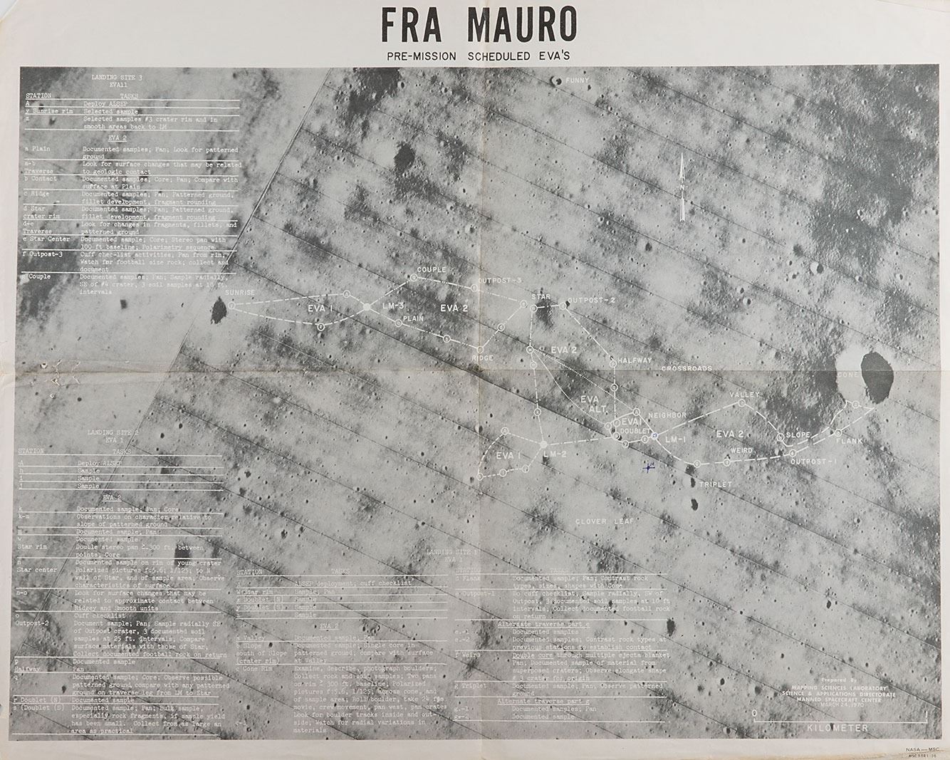 Scarce pre-mission landing site map for the Apollo 13 mission, 22 x 17, dated March 24, 1970, which shows an overhead view of the Fra Mauro region and the potential landing sites of the Lunar Module Aquarius, with information related to the mission's planned two EVAs. Prepared by the Mapping Sciences Laboratory, Science & Applications Directorate at the Manned Spacecraft Center. In very good to fine condition, with expected folds, tack holes, light toning, and chips and holes to borders, which could be easily matted out if so desired.