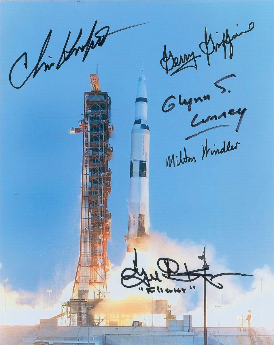 Color glossy 8 x 10 photo of a Saturn V rocket launch, signed in black felt tip by five flight directors, including: Chris Kraft, Gerry Griffin, Glynn S. Lunney, Milton Windler, and Gene Kranz, who adds “‘Flight.’” In very fine condition.